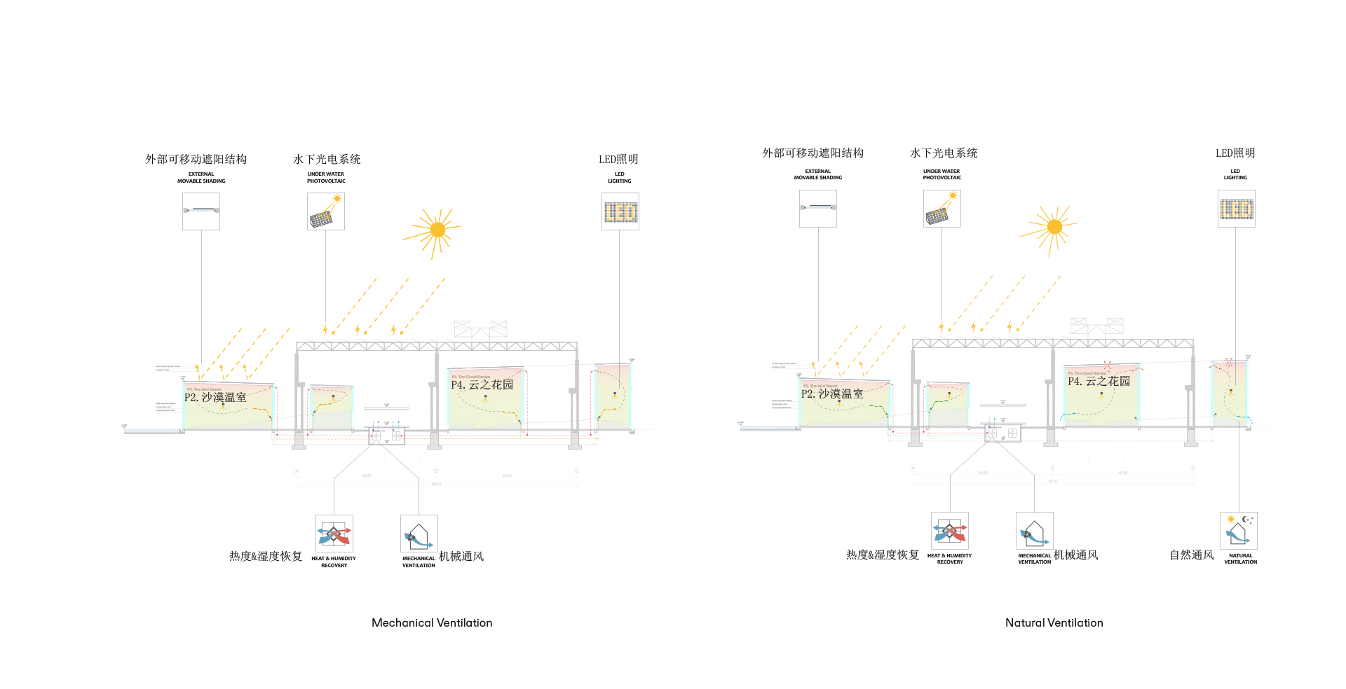 Für die Erstellung eines Wüsten- und eines tropischen Klimas war ursprünglich eine Konditionierung mit Klimatechnik für die Gewächshäuser vorgesehen. Zur Reduzierung des enormen Energieaufwands war eine zweifache Wärmeschutzverglasung angedacht. Eine solche Verglasung hat den großen Nachteil, dass viel Einstrahlung verloren geht, was unter Umständen mit Kunstlicht ausgeglichen werden müsste, damit die Pflanzen gedeihen, denn vorgesehen sind Gewächse, die aus klimatischen Zonen stammen, die sehr viel Licht bieten: Die Gewächshäuser dieses Projekts sollen eine Wüste beherbergen, einen tropischen Regenwald und den Wolkengarten.