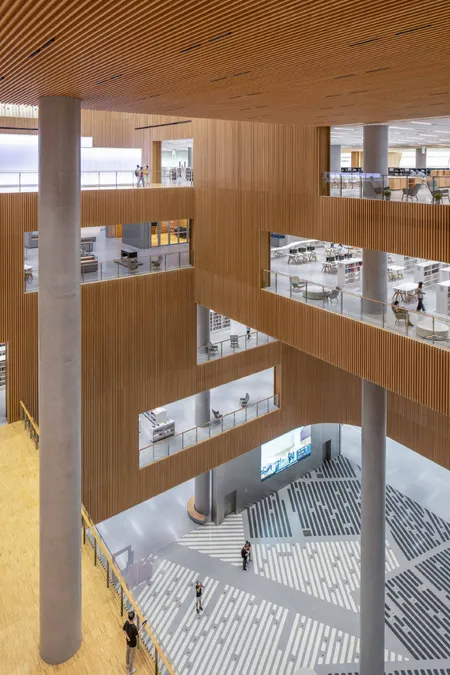 Die Bibliothek ist mit drei gestaffelten Lesesälen um ein großes zentrales Atrium angelegt. Diese sind offen und schaffen Verbindungen der verschiedenen Bereiche der Bibliothek zu den unterschiedlichen Stadtteilen: Zum Century Park nach Osten, zum neuen Bibliothekspark im Süden und zur Stadt im Norden und Westen. Das Gebäude verschattet sich in gewisser Weise durch die leicht verdrehten Fassaden selbst. Die Fassade, welche aus einer bedruckten 2-Scheiben Sonnenschutzverglasung besteht, wurde auf Tageslicht, Vermeidung von Blendung und Reduktion solarer Lasten optimiert. Große offene Atrienbereiche an jeder Fassade schaffen markante Fenster, die einen ungehinderten Panoramablick auf den Park und die Stadt bieten. Ausgewählte Bereiche wie die mehrstöckigen Atrien werden durch eine effiziente Fußbodenkühlung in Kombination mit einer Quelllüftung gekühlt. Die große, horizontal installierte Photovoltaik-Anlage auf dem Gebäudedach erzeugt vor Ort emissionsfrei erneuerbare Energie.