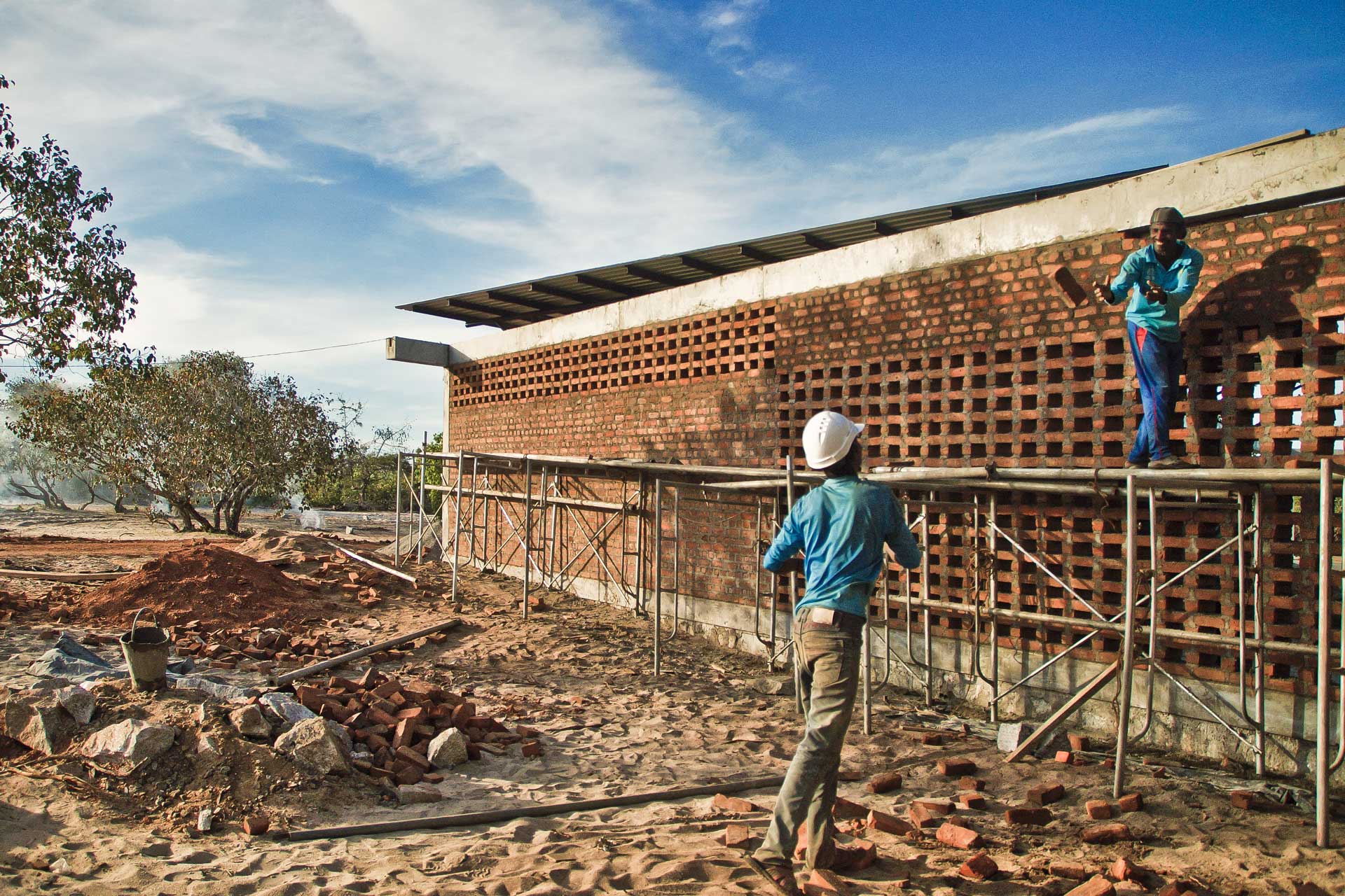 Lehmziegel haben in Sri Lanka lange Tradition. Das Baumaterial wird ohne hohen technischen Aufwand hergestellt und erlaubt den Nutzern Reparaturen selbst durchzuführen. Qualität und Abmessungen der Ziegel sind allerdings sehr unterschiedlich. Daher musste darauf geachtet werden, welche Ziegel der Witterung ausgesetzt werden und welche sich nur für Innenwände eignen. Die Architekten von feat.collective waren während der gesamten Bauzeit vor Ort.