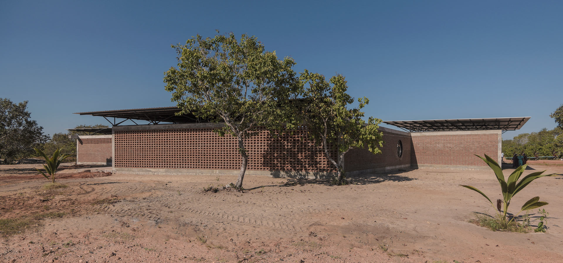Die Pavilions nutzen gezielt die bestehenden Bäume als Schattenspender. Auch die weit auskragenden Dächer verschatten Innenraum und Wände. Die Räume vermeiden Hitzestau durch den Abstand zwischen Baukörpern und Dächern. Deren Aluminiumsheets reflektieren zudem einen Teil der Sonnenenergie und minimieren das Abstrahlen der Wärme durch Ihre low-e Oberflächeneigenschaft. Das spendenfinanzierte Budget erlaubt keine verglasten Fenster, daher sind die perforierten Mauern eine gute Lösung, denn sie ermöglichen so erst die Nutzung des Gebäudes in den heißen Sommermonaten: Der meist wehende leichte Wind zieht unterhalb der Dächer und durch die perforierten Mauern und führt die Wärme ab. Schiebefaltwände aus Holz ermöglichen das Konzept der flexiblen Mehrfachnutzung der Räume .