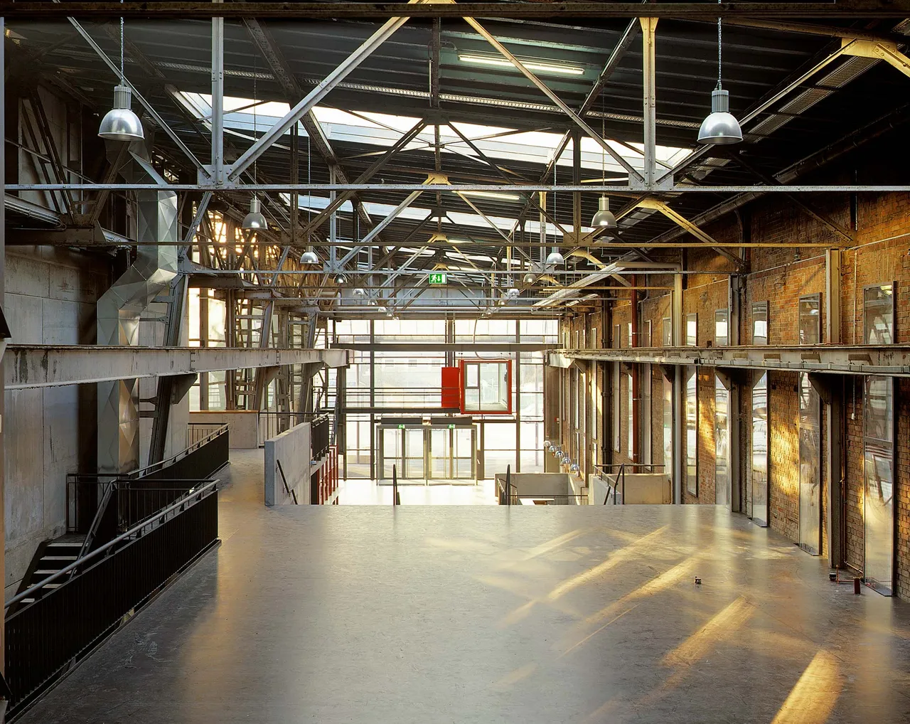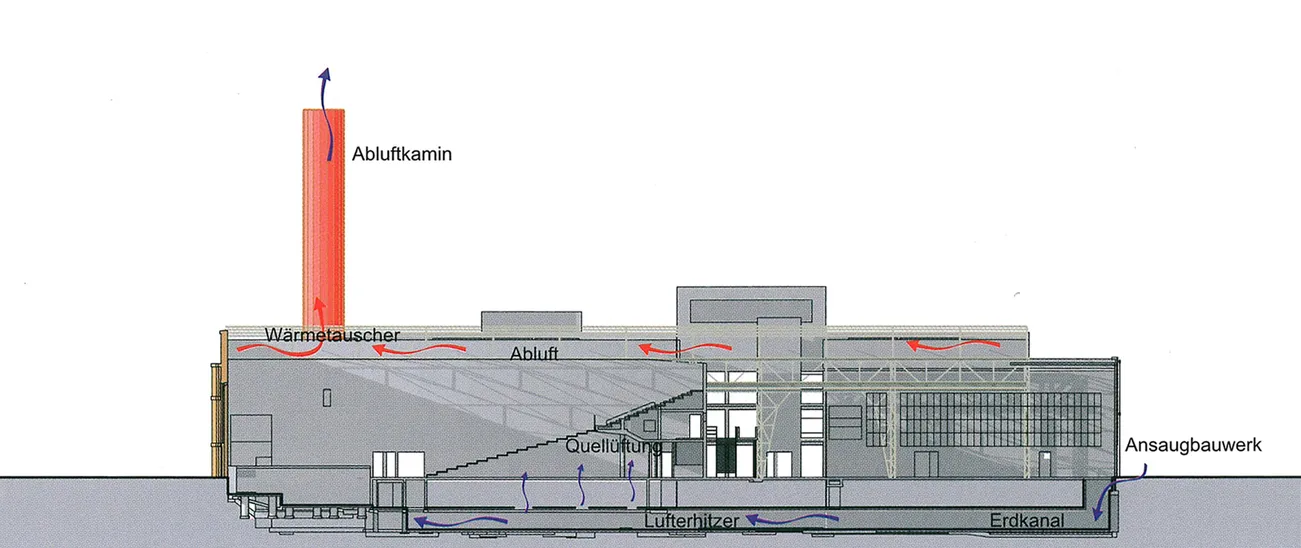 Die Frischluft strömt unter dem Gebäude in Kanälen zu den einzelnen Hallen. Die Kanäle sind zum umliegenden Erdreich ungedämmt belassen. Wie in einem traditionellen Keller wirkt dies ausgleichend auf die Zulufttemperatur, die im Sommer vorgekühlt und im Winter vorgewärmt wird. Die Luft quillt mit geringer Geschwindigkeit in die Hallen ein, sammelt sich am Boden und steigt dann sobald sie sich erwärmt langsam in die Höhe. Unter dem Hallendach strömt sie über Kanäle in den hoch aufragenden Abluftkamin nach außen. Angetrieben wird dies durch den thermischen Auftrieb, die Temperaturdifferenz zwischen innen und außen.