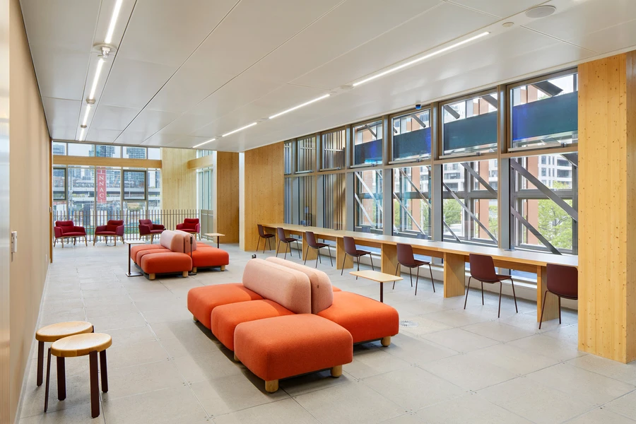 Transsolar arbeitete gemeinsam mit dem Designteam an der Entwicklung einer klimaresistenten Fassade mit einem integrierten Belüftungskonzept, das für einen natürlichen Luftstrom und Tageslicht im gesamten Gebäude sorgt. Im Mittelpunkt dieser Strategie stehen die markanten, doppelt so hohen „Breathing Rooms” auf jeder Unterrichtsetage, die mit zwei Solarkaminen kombiniert sind. Zusammen ermöglichen sie natürliche Belüftung, Tageslicht und Räume für Ausblicke und schaffen gleichzeitig eine vertikale Verbindung, die das gesamte Gebäude vereint.
