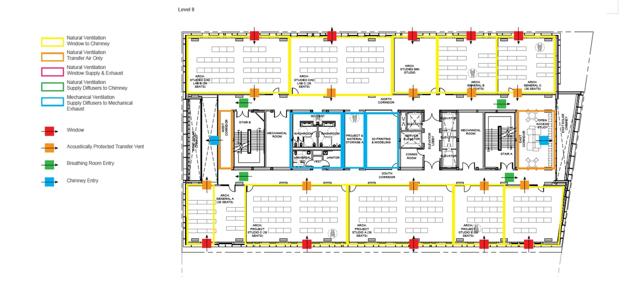 Das Gebäude verfügt über Doppelböden zur Unterstützung der mechanischen Belüftung, während Strahlungsdeckenplatten für Heizung und Kühlung sorgen. Anstelle eines zentralen HLK-Systems ist jede Etage mit zwei Energierückgewinnungsventilatoren (ERVs) ausgestattet. Im aktiven Modus wird Frischluft in den Hohlraum unter den Doppelböden geleitet, und die Raumlüftungsöffnungen öffnen sich automatisch, wenn Räume belegt sind, wodurch die Luft effizient im gesamten Gebäude verteilt wird, während die Strahlungsplatten für angenehme Temperaturen sorgen.