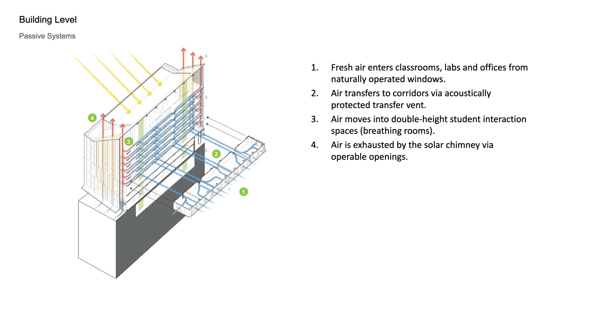Im Frühjahr und Herbst wird das Gebäude vollständig auf natürliche Belüftung umgestellt. Warme, verbrauchte Luft aus den Klassenzimmern steigt in die doppelt so hohen „Breathing Rooms” auf und wird durch die Kamine nach oben gezogen, während frische Außenluft durch zu öffnende Fenster eindringt. Dieser Prozess sorgt für eine natürliche Belüftung und verbindet die Räume des Gebäudes miteinander, wodurch ein angenehmes Raumklima bei minimalem Energieverbrauch entsteht.