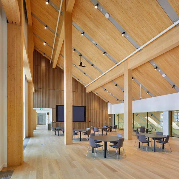 Ontarios erstes institutionelles Gebäude aus Massivholz mit geringem CO2-Ausstoß. Das Gebäude vereint eine vielfältige Mischung aus Unterrichts-, Sport-, Kinderbetreuungs- und Veranstaltungsräumen und