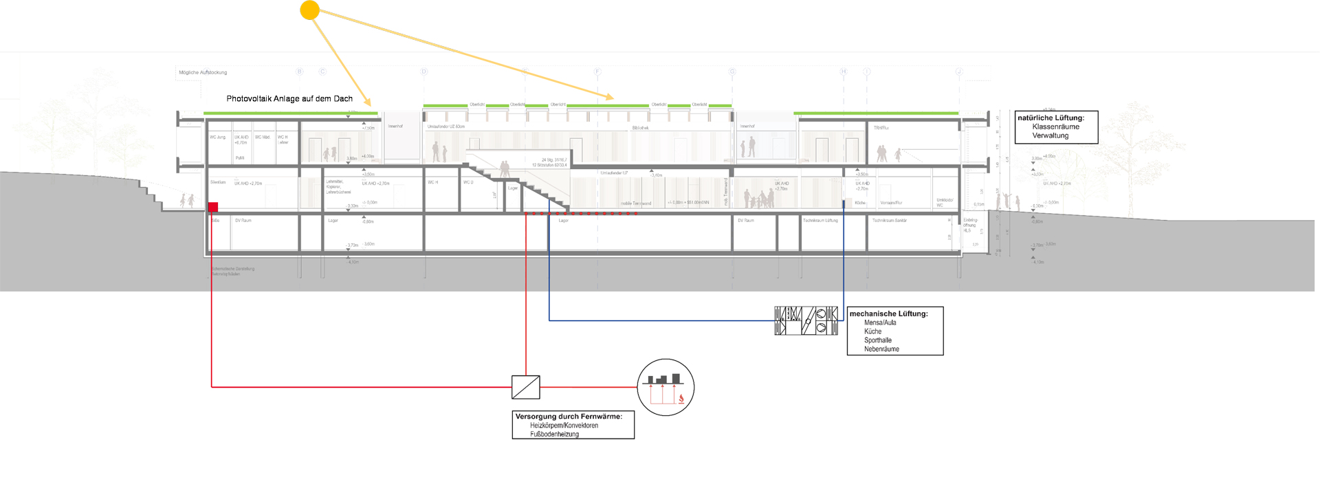 Lediglich die Mensa der Schule und die Sporthalle sowie innenliegende Sanitär- und Nebenräume erhalten jeweils eine mechanische Lüftung.