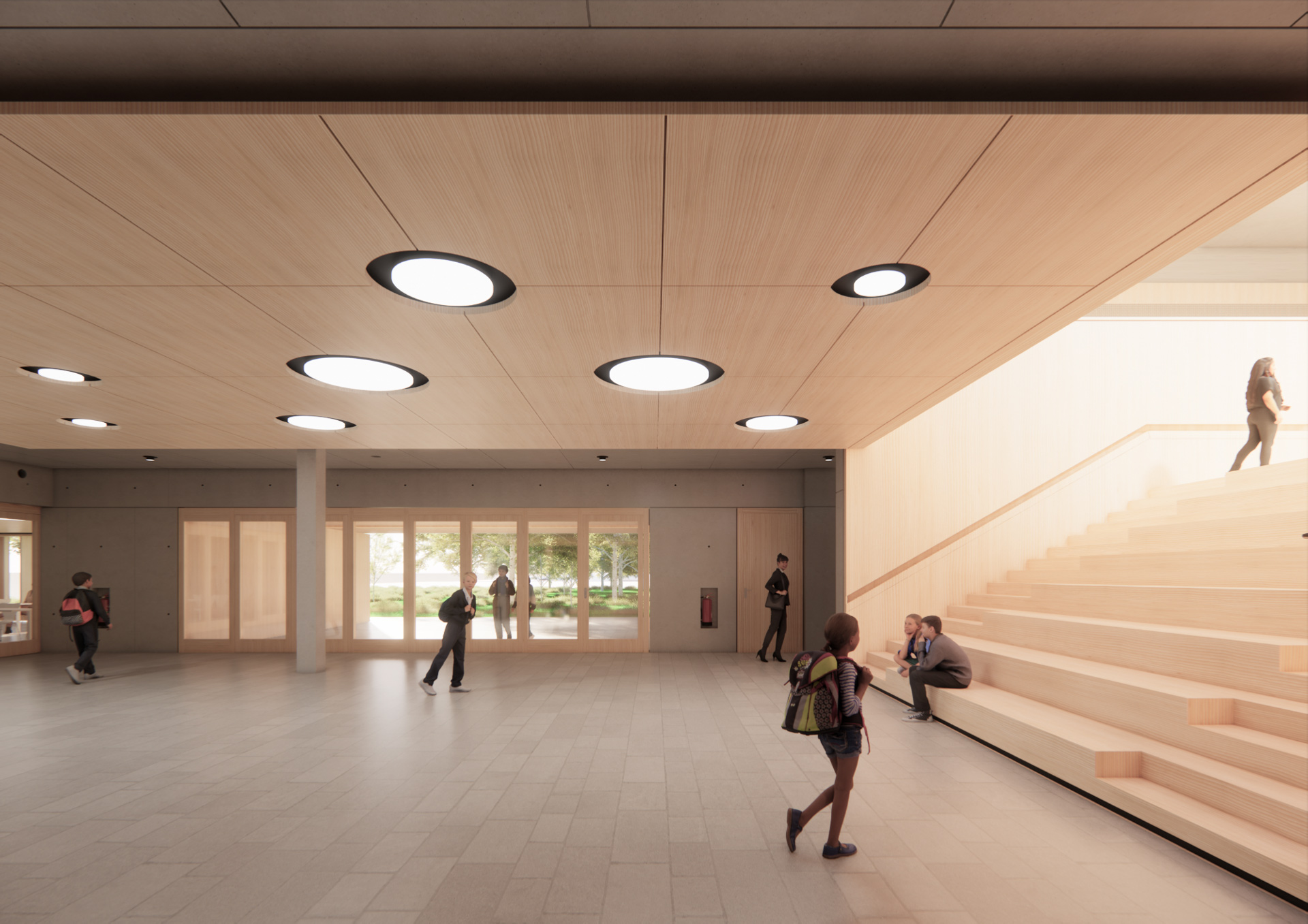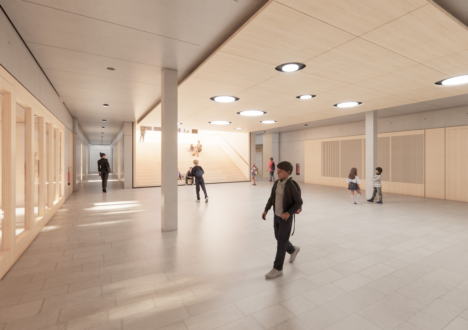 Eine einfache Grundrissstruktur im Inneren ermöglicht eine gute Orientierung. Die Eingangshalle dient als Verteilerzone. Sie ist mit dem Speisesaal zusammenschaltbar. Die große Eingangstreppe dient als zentrales, kommunikatives Forum, Sitzelemente ermöglichen Aufführungen. Klassen und Fachräume sind in den Obergeschossen angeordnet, die Räume für die Nachmittagsbetreuung im EG mit Anschluss an die Außenanlagen. Eingeschnittene Höfe sorgen für eine gute Belichtung und Belüftung der Kernzonen. Die Bibliothek bildet die zentrale Lernmitte. Auch die Flure bieten Flächen für offene Kommunikations- und Lernmöglichkeiten.