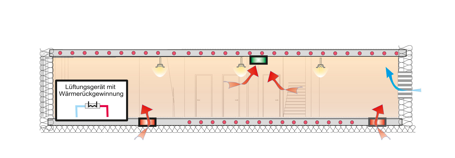 In den Wintermonaten wird das Gebäude durch hocheffiziente Lüftungsgeräte mit Frischluft versorgt. Sofern die äußeren Bedingungen es zulassen, wird die mechanische Lüftung abgeschaltet und das Gebäude natürlich belüftet. Für die Konditionierung der Kletterhalle kommt ein bivalentes Heizsystem, bestehend aus einer Wärmepumpe (versorgt über Erdsonden) kombiniert mit einem Gasbrennwertkessel zum Einsatz. Die Erdsonden können über Direktkühlung zugleich als Kühlungsmöglichkeit verwendet werden. Somit kann auf eine mechanische Kühlung verzichtet werden. Photovoltaikmodule auf dem Dach können für den Betrieb elektrischer Geräte verwendet werden und somit die Energiekosten des Gebäudes reduzieren.