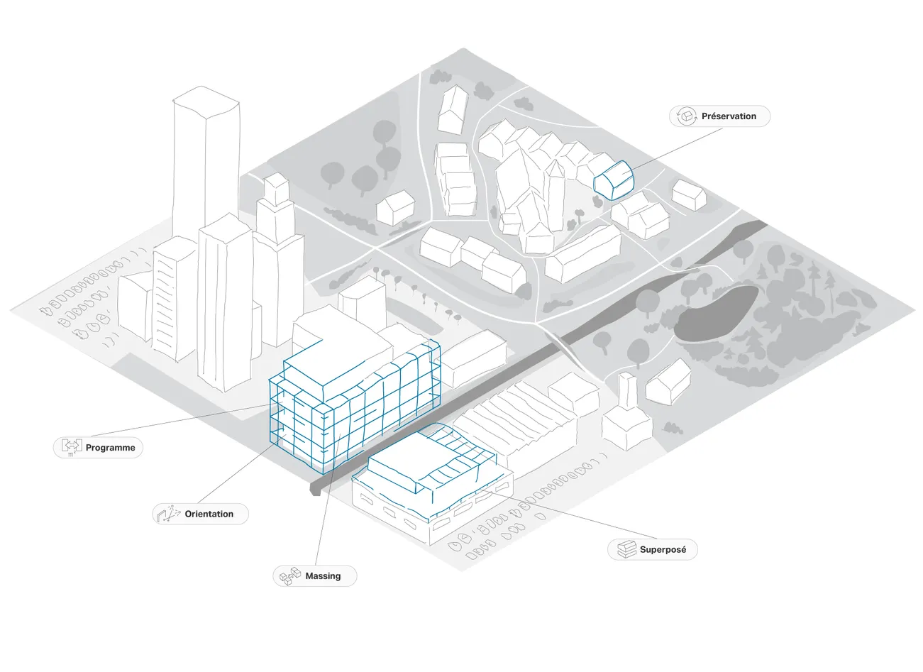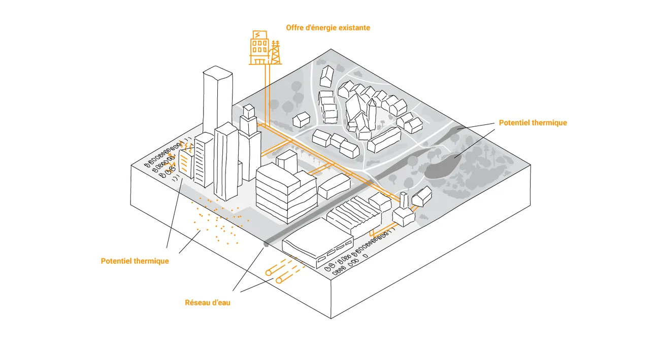 Les bâtiments existants, les infrastructures, les espaces verts et les plans d’eau créent des conditions limites qui façonnent le potentiel du site. Pour assurer un approvisionnement en énergie renouvelables, nous étudions la disponibilité et la résilience futures des ressources possibles comparées aux besoins du bâtiment et aux coûts potentiels.