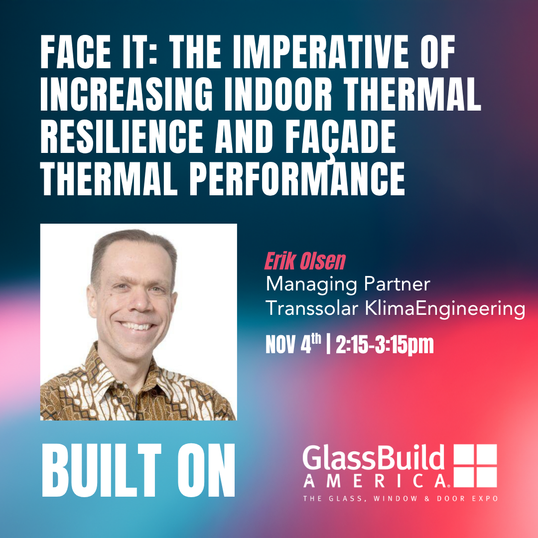 On November 4, Erik Olsen will join industry leaders at the GlassBuild America Conference in Orlando to discuss the critical role of glazing in building performance. His presentation, “Face It: The Imperative of Increasing Indoor Thermal Resilience and Façade Thermal Performance,” will explore how glass selection impacts not only energy use but also occupant comfort, equipment sizing, and building habitability during power outages.