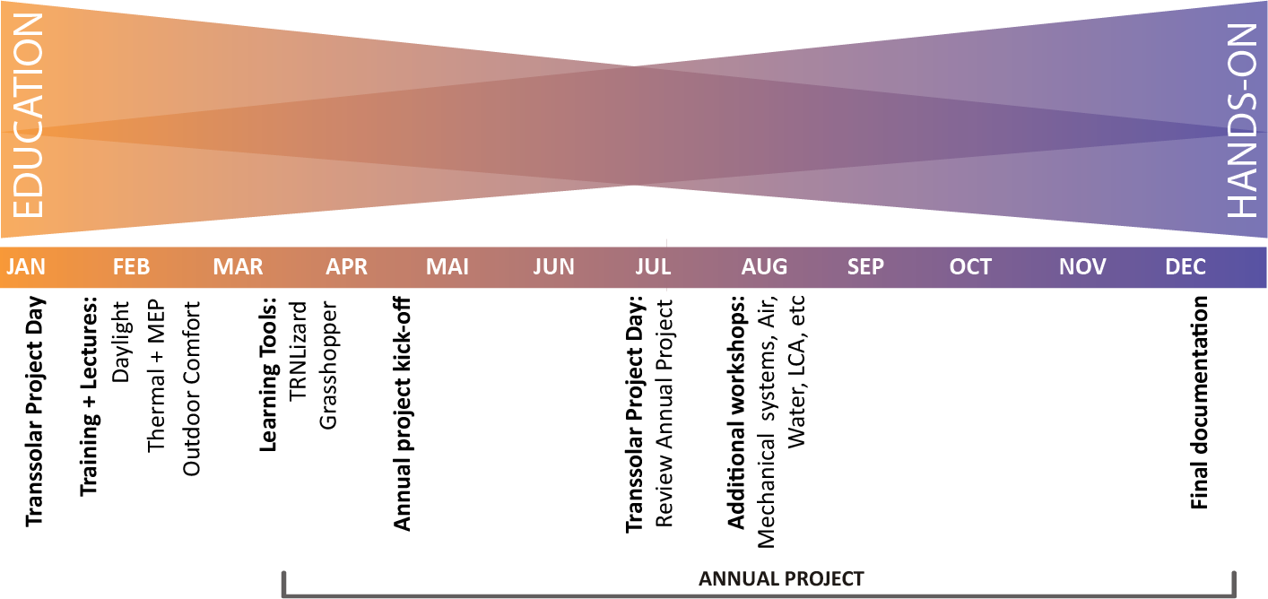 We have started the third part of the Transsolar Academy education program, with a twist: Instead of working an individual personal project, this cohort is working on an annual project as a group. The aims are to practice the integrated design process by collaborating as a team, and to deepen their knowledge base for particular climate responsive strategies. For this inaugural annual project, we have the honour of investigating the Language Laboratory in Auroville, India.