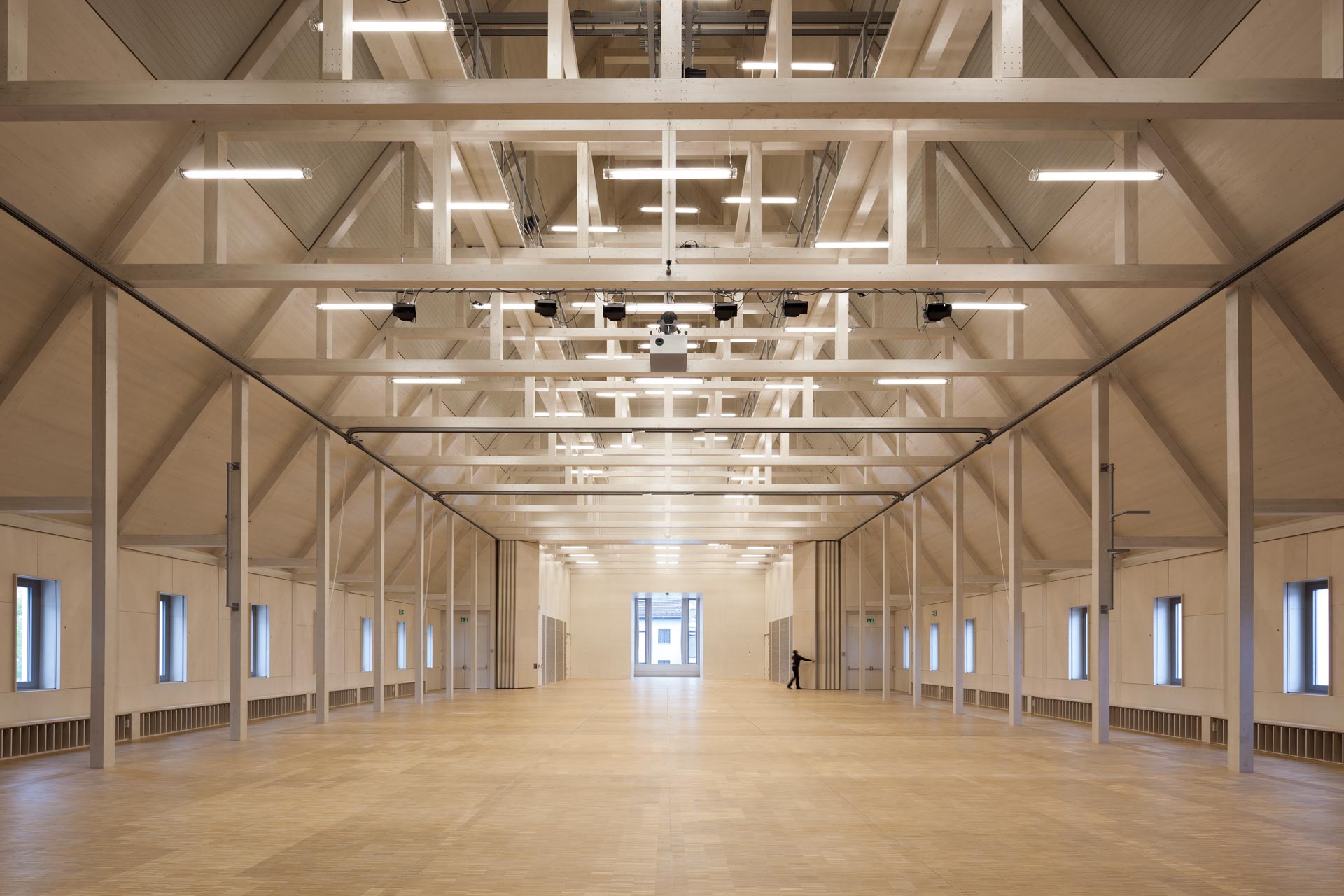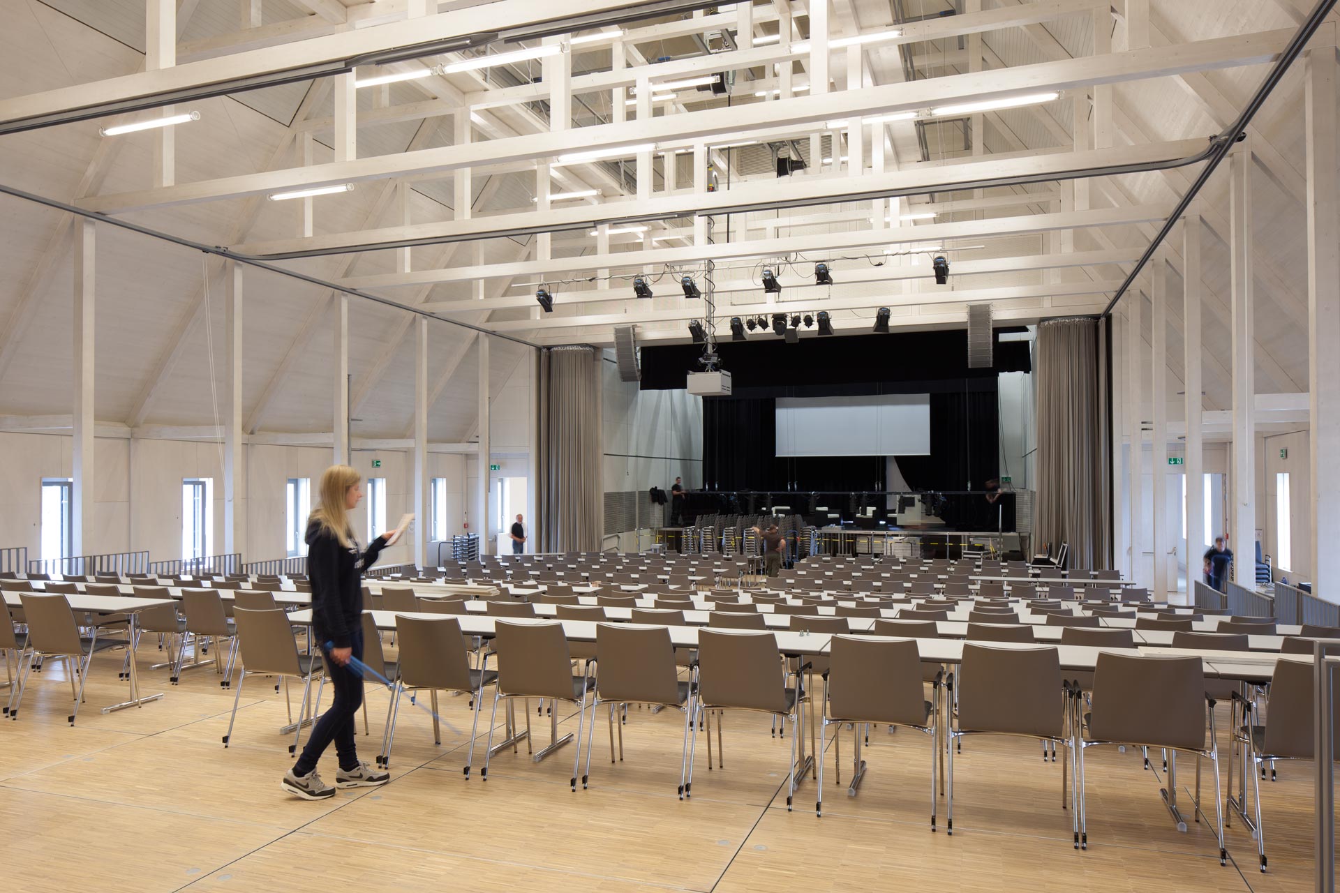 Le bâtiment neuf dispose d’une enveloppe hautement isolée et étanche ainsi que des centrales de traitement d’air avec récupération de chaleur. La majorité des salles a recours à un plancher actif réversible qui permet de chauffer et refroidir, la grande salle disposant en plus d’un plafond rayonnant. L’air neuf est distribué en déplacement depuis les sièges et les gradins au sein de la grande salle. Contrairement à une ventilation mixte, les 800 personnes sont alimentées directement en air neuf, en mettant à profit le potentiel de rafraichissement de l’air tempéré à 18°C et partiellement déshumidifié.