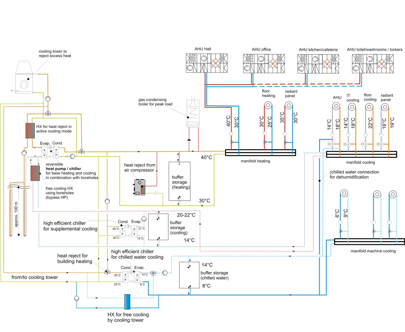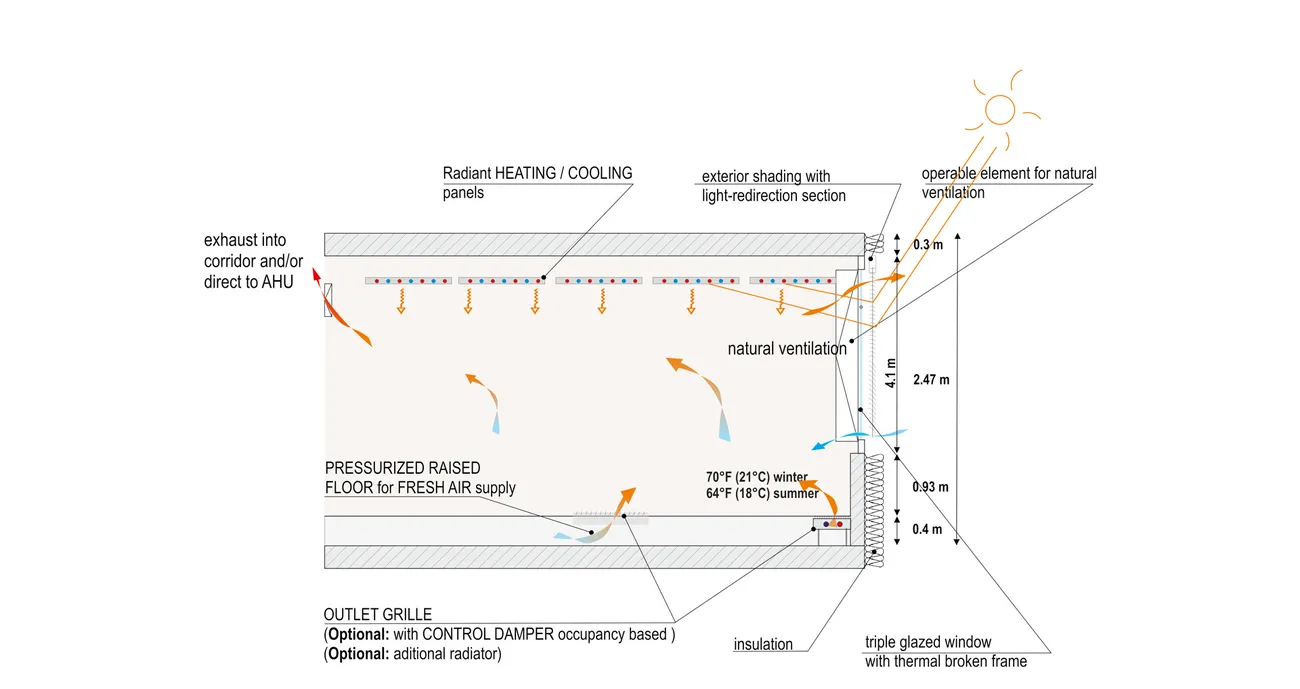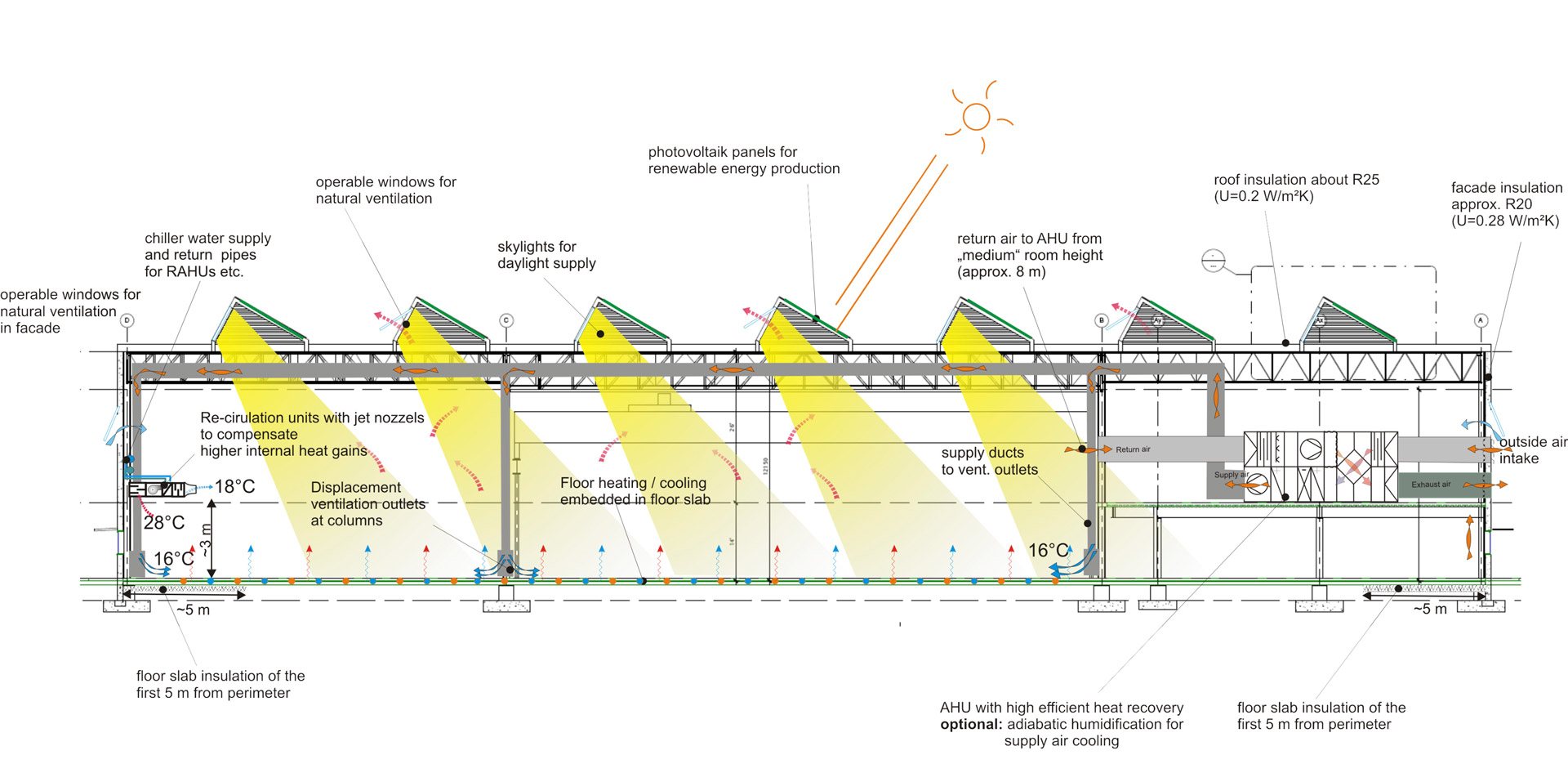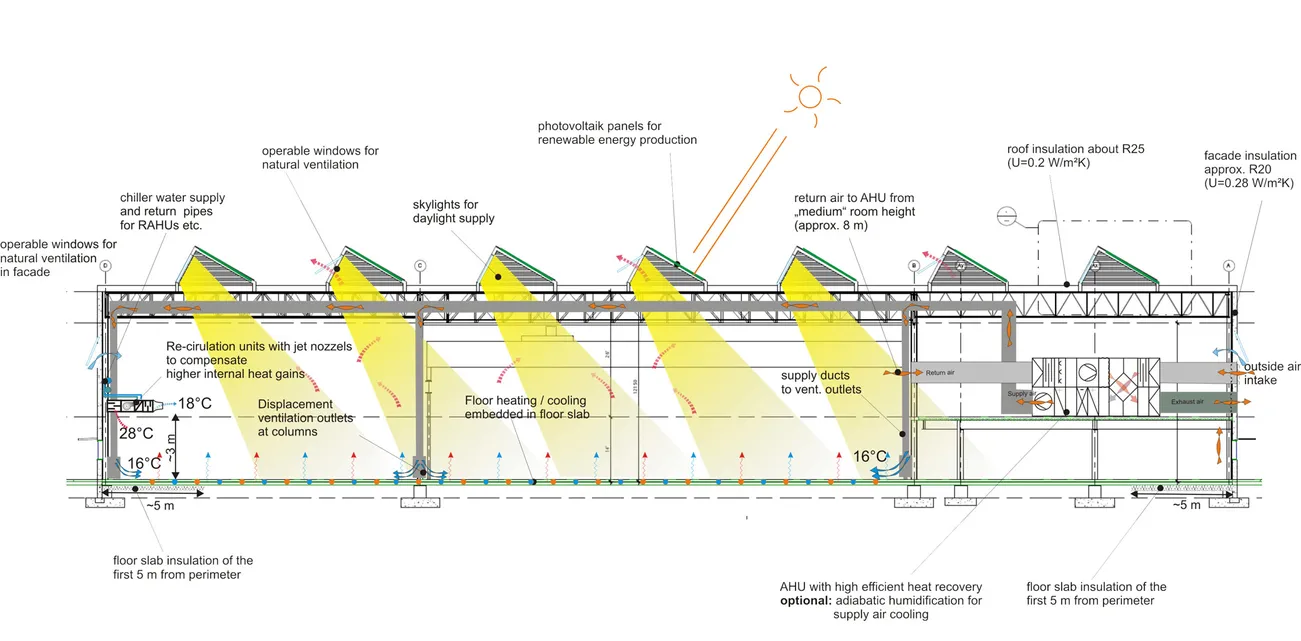 Athena est une entreprise privée de production qui a développé une plateforme révolutionnaire de machine à injection équipée d’un large panel d’options de spécification. Le nouveau « Systems Center » de l’entreprise basé près de Toronto inclut un espace dédié aux essais de moulage, un laboratoire de contrôle de qualité doté d’un équipement de mesure de pointe, un espace administratif, une cafétéria et un centre de fitness. L’équipe en charge du projet a travaillé à la minimisation de la consommation énergétique des différents espaces tout en assurant le plus haut niveau de qualité. Une série de forages géothermiques sont utilisés comme source de chaleur, un plancher chauffant fournit un confort local pour les ouvriers de la zone de production industrielle. Dans le but d’assurer un accès à la lumière naturelle suffisant, des sheds orientés au Nord sont intégrés aux toitures pour fournir un éclairement naturel en évitant les risques d’éblouissement. La ventilation par déplacement est utilisée pour le renouvellement d'air hygiénique et des ouvrants de fenêtres sont prévus pour une ventilation naturelle pendant les saisons intermédiaires. L'engagement du propriétaire pour une haute qualité et des espaces adaptés a également abouti à une GTB avancée qui permet un contrôle détaillé des différentes zones en fonction des besoins de confort. Les individus sont en mesure de remplacer les commandes automatiques pour des périodes définies si ces dernières nécessitent des conditions différentes pour travailler. Des simulations thermiques détaillées et de la lumière du jour ont été effectuées pour s’assurer que les performances atteindraient les objectifs. La construction a été achevée fin 2015 et le suivi commencera en 2016.