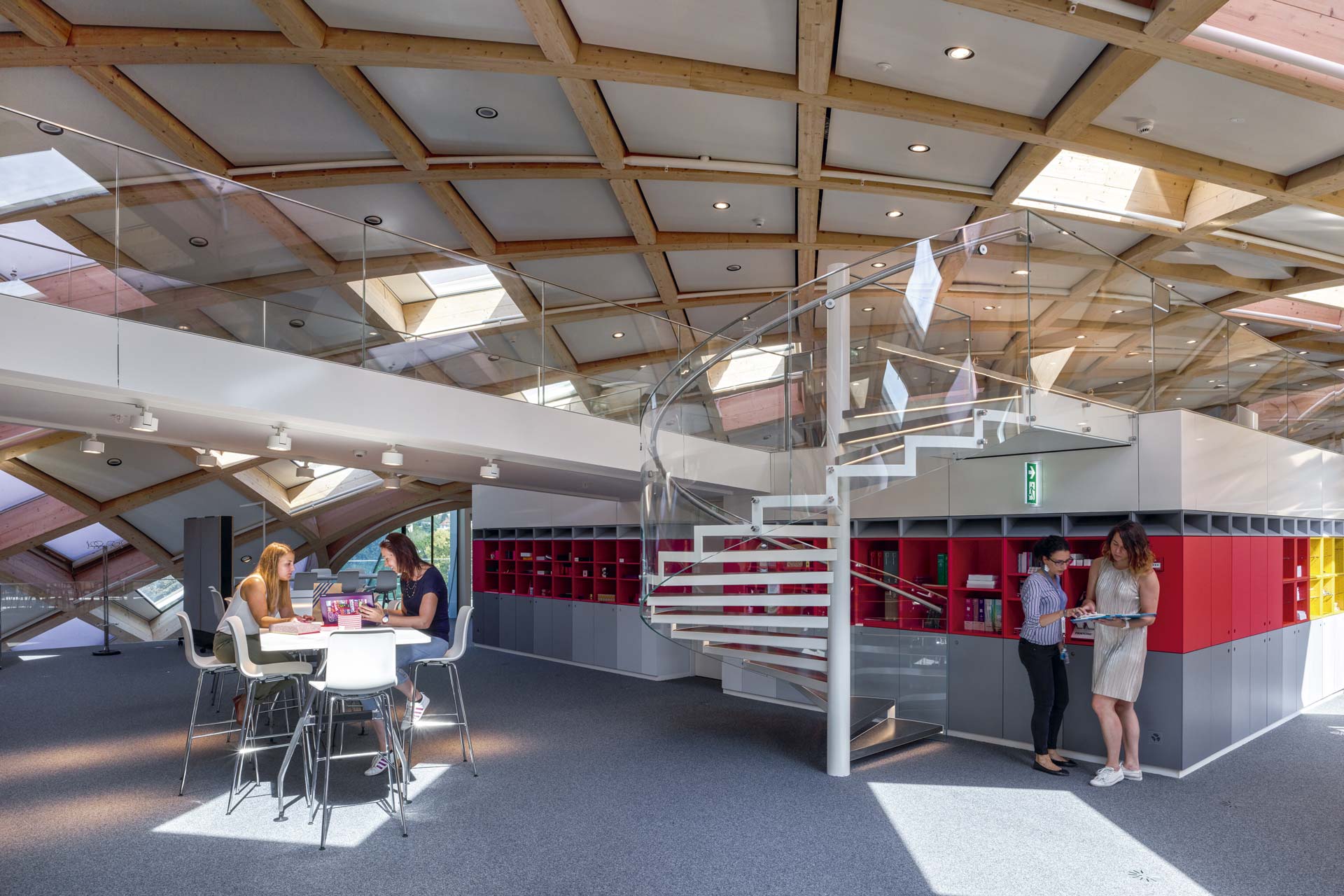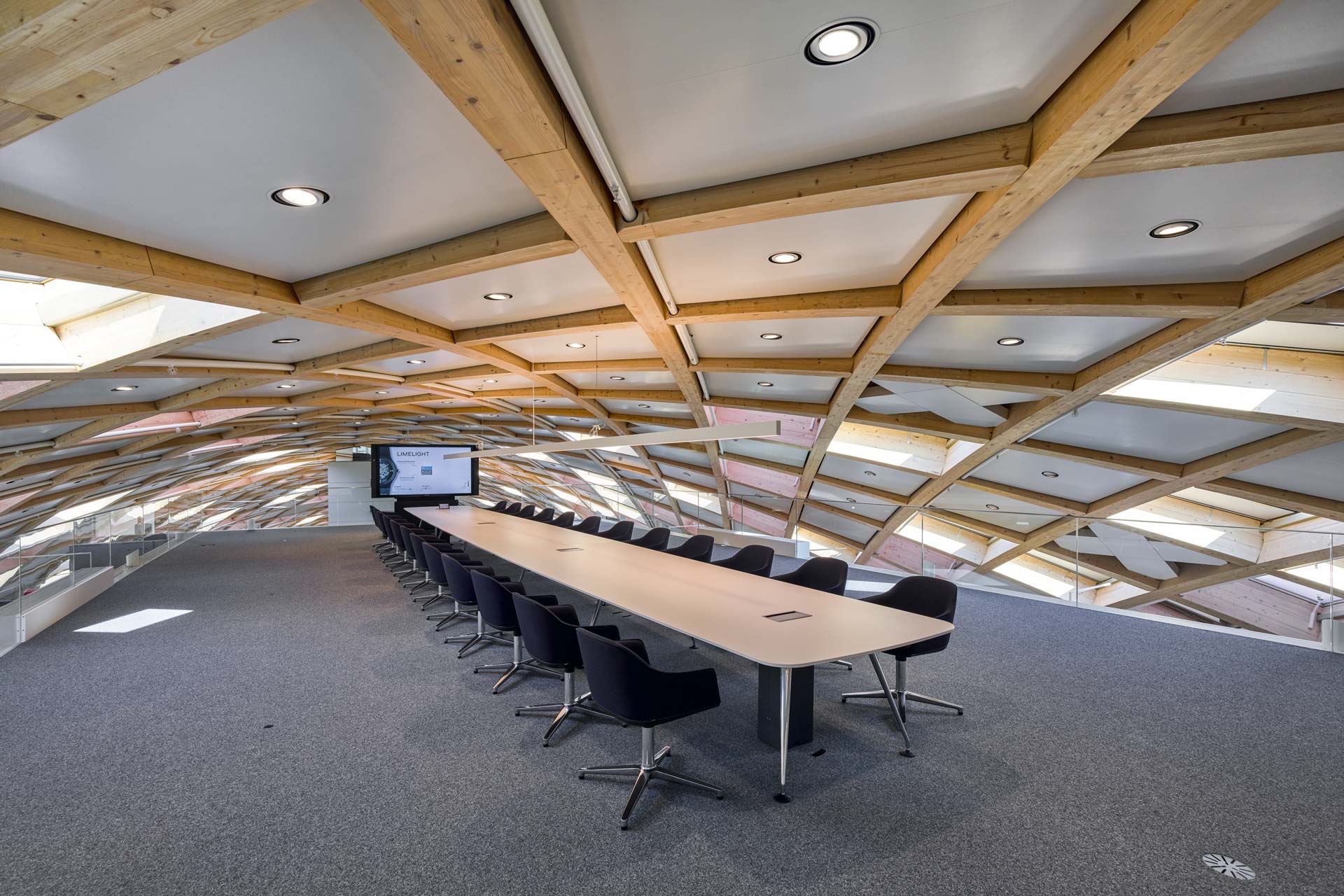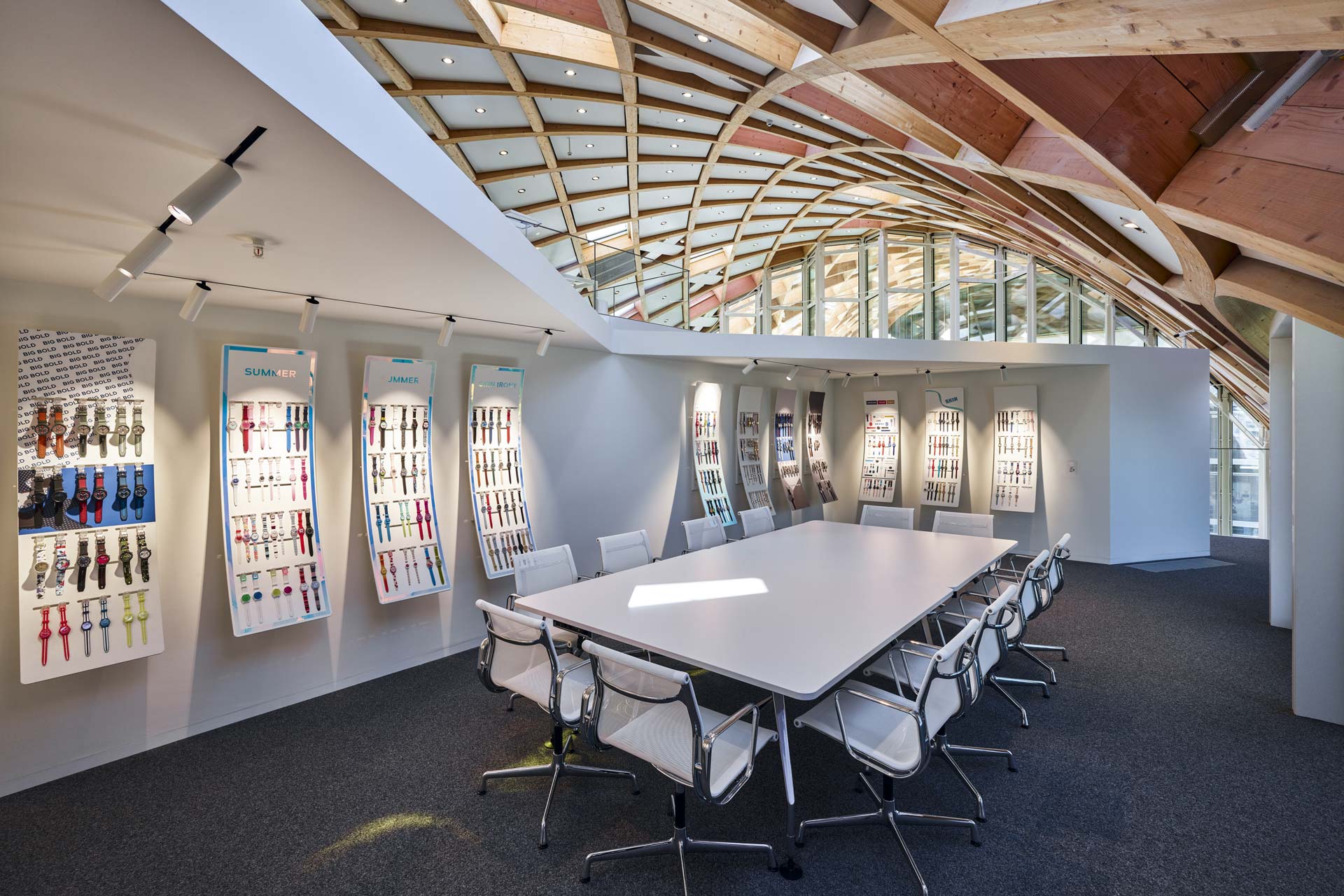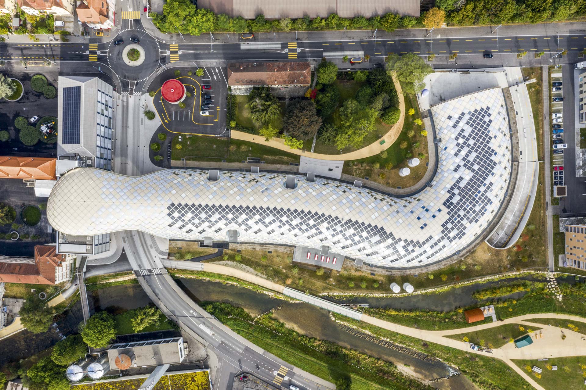La forme sinueuse du siège social s'étend de l'autre côté de la rue pour le Musée Cité du Temps. Un pont au troisième étage relie les deux bâtiments. La construction du toit en treillis se compose de 4.600 éléments individuels en bois qui s'emboîtent les uns dans les autres. Le concept du bâtiment est axé sur le confort des employés, leur bien-être et leur productivité: des éléments acoustiques sont insérés dans les plafonds en béton et un système d'activation du noyau en béton assure le confort thermique. Une ventilation mécanique couvre les exigences hygiéniques minimales, l'air d'alimentation entre dans le bâtiment selon le principe du déplacement, minimisant ainsi le risque de courants d'air et assurant une grande efficacité de ventilation. Trois éléments de construction différents forment l'enveloppe de la façade d'environ 11.000 m²: des éléments en verre à triple vitrage permettent de limiter les pertes thermiques, les ombres à l'extérieur sont protégées par une simple vitre en verre formant une cavité fermée. Ensuite, il y a des éléments de membrane translucides avec de faibles valeurs U et une couche intermédiaire spéciale qui permet à la lumière diffuse d'entrer. Troisièmement, il y a les éléments fermés avec la valeur U la plus faible, qui sont recouverts de PV là où ils sont horizontaux ou orientés au sud. Leur disposition et leur distribution proportionnelle ont été optimisées en fonction de la vue (éléments vitrés), de la répartition de la lumière du jour dans la pièce, de la valeur U globale et des meilleurs gains énergétiques pour le PV.