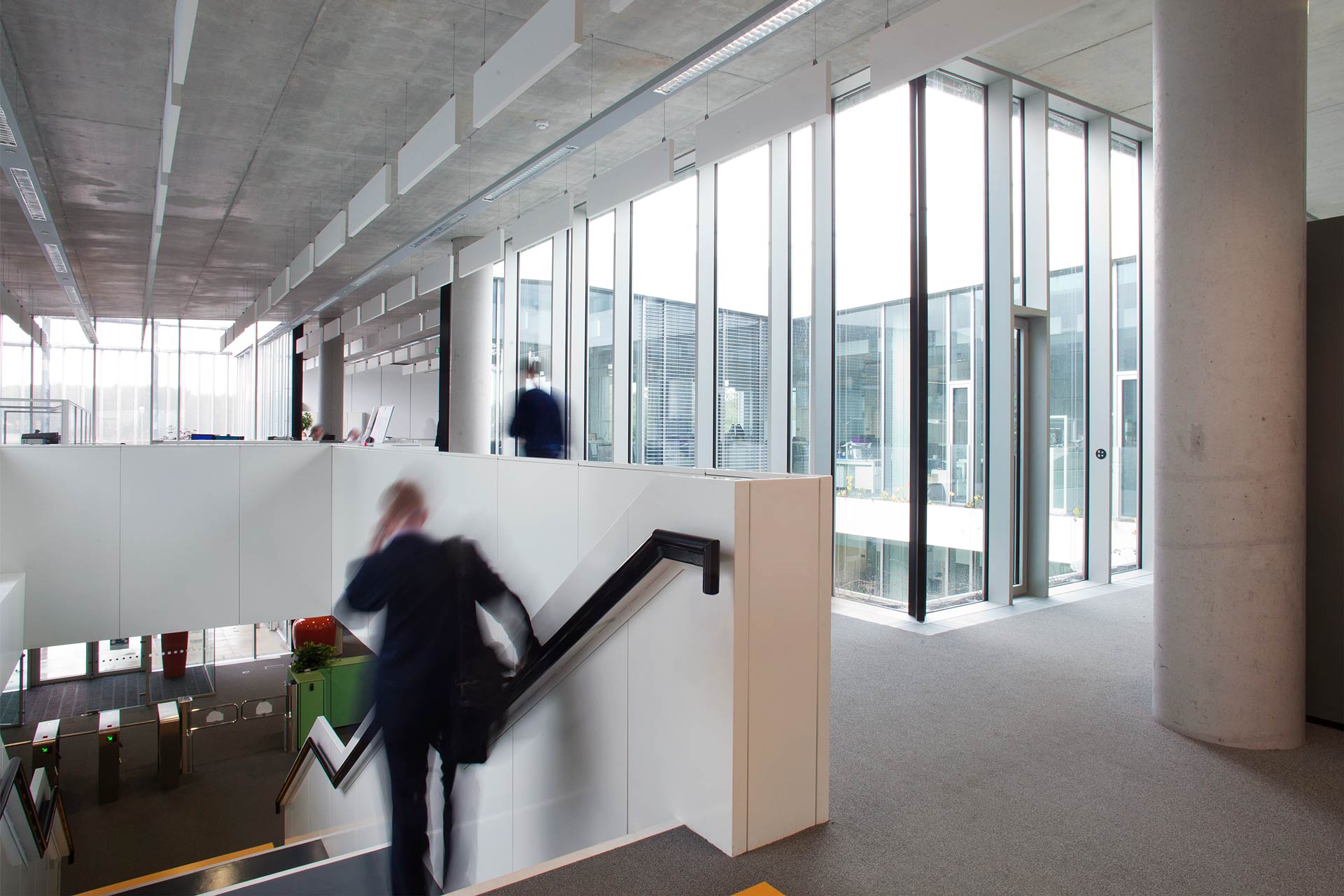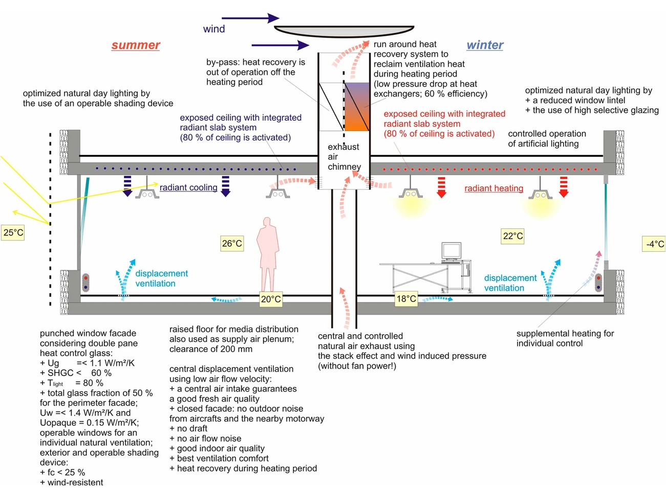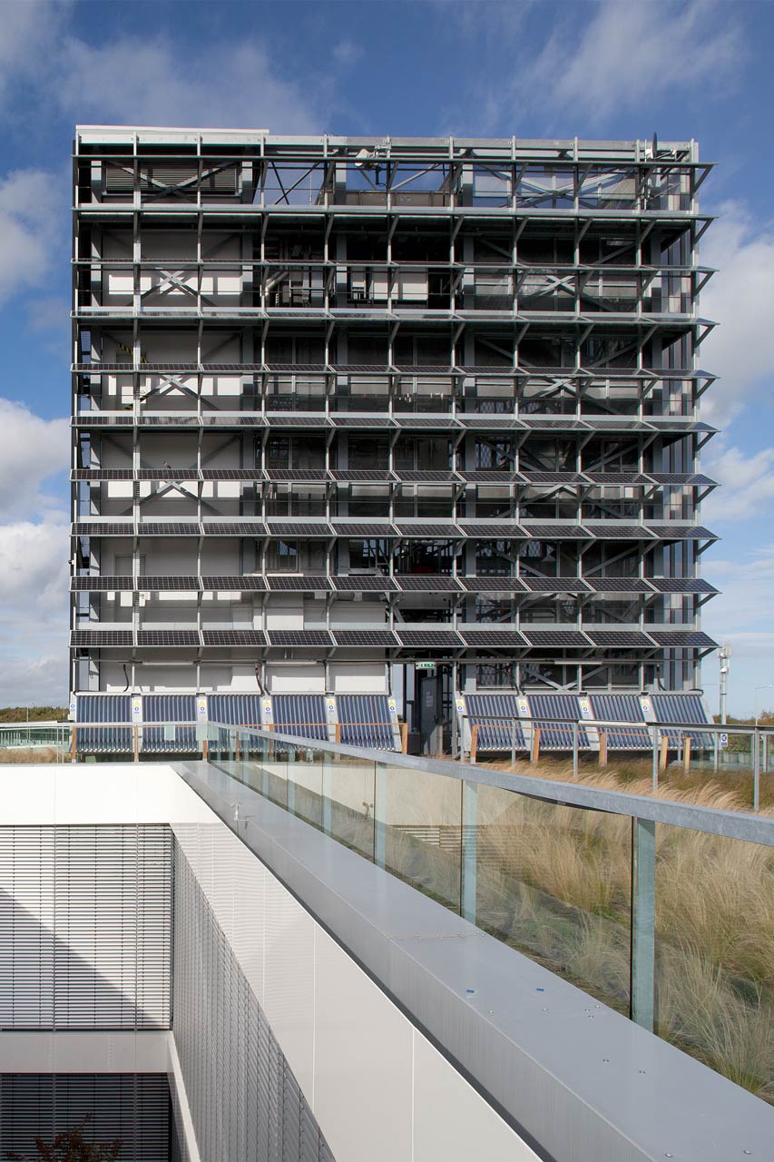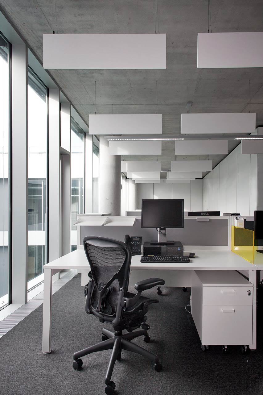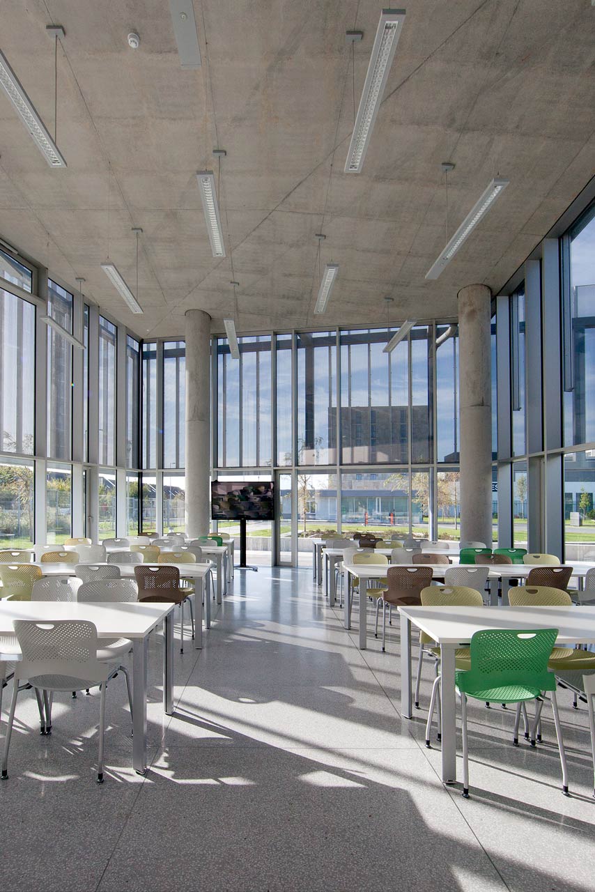 Le nouveau siège du fournisseur de gaz irlandais Bord Gáis regroupe des bureaux administratifs, une cantine, des salles de conférence et une salle centrale de commandes. Les cavités Cobiax intégrées dans les plafonds en béton assurent un conditionnement agréable par radiation, tout en réduisant l’énergie grise ainsi que la quantité de matériau nécessaire à la construction. Le niveau sonore est réduit par des absorbeurs acoustiques suspendus au plafond. Une ventilation par déplacement assure l’apport d’air frais à travers un système sous le plancher avec plénum pressurisé. L’absence de conduits de ventilation au sol permet une flexibilité maximale. La ventilation d’extraction à récupération thermique est naturellement dissipée aux deux étages via une cheminée centrale d’évacuation fonctionnant grâce au tirage thermique et à la pression du vent. Des radiateurs intégrés au sol pour du chauffage supplémentaire et des fenêtres ouvrables permettent un contrôle du confort individuel. Le rideau métallique résistant au vent qui entoure la façade apporte de l’ombre parallèlement au double-vitrage isolé transparent. Les cours intérieures apportent de la lumière naturelle dans les bureaux et ajoutent de la verdure à l’ensemble. Les façades donnant sur ces cours sont équipées de stores vénitiens traditionnels. L’eau de pluie est récupérée pour alimenter le système d’irrigation et des dispositifs économiques en eau ont été installés dans tout le bâtiment. D’après les études des dernières années, le nouveau siège de Dublin consomme 50 à 60% moins d’énergie que les autres bureaux de l’entreprise. Le concept énergétique regroupe les aspects suivants: récupération thermique dans tout le bâtiment; pompe à chaleur réversible avec champ géothermique: cogénération au gaz en back-up; panneaux photovoltaïques; et capteurs solaires thermiques pour le chauffage de l’ECS.