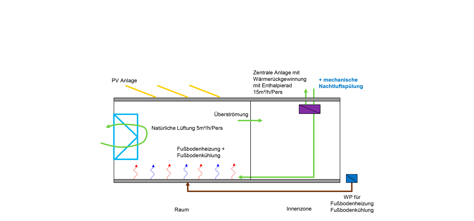 Heating or cooling is supplied by a reversible heat pump. Through energy efficiency in combination with local renewable power generation through photovoltaics on the roof, the goal lies in sight: At least a zero-energy standard, i.e. that the building generates as much energy in the annual balance as it needs, or even more, which is to be proven. Exact figures will be provided by monitoring.