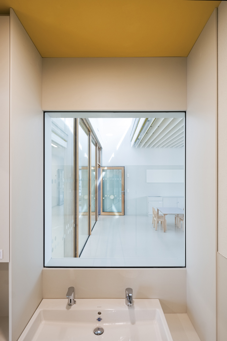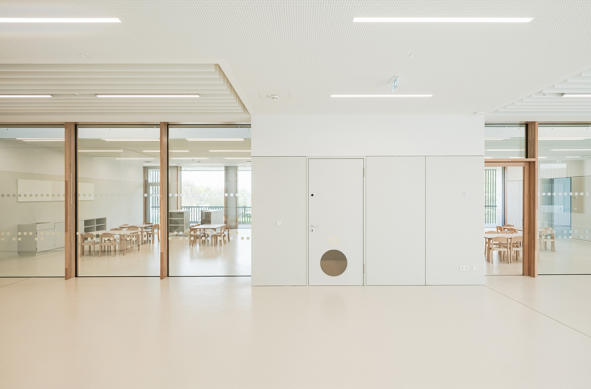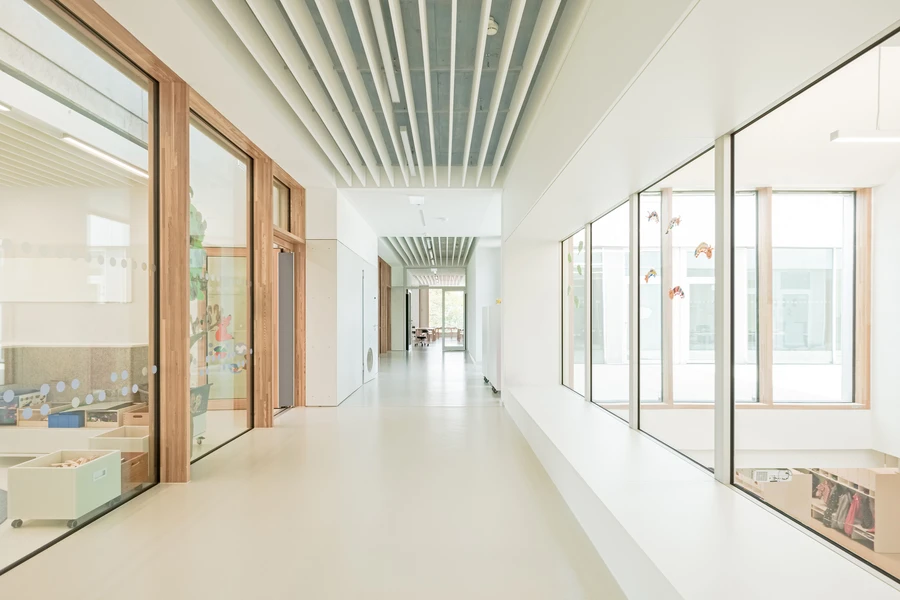 Because daylight is very beneficial for the overall human well-being, the group rooms on the upper floor are supplied with daylight from the façade and the specially developed air and light chimneys. On the exposed facades, the externally mounted sun protection with daylight deflection prevents from too much light inside.