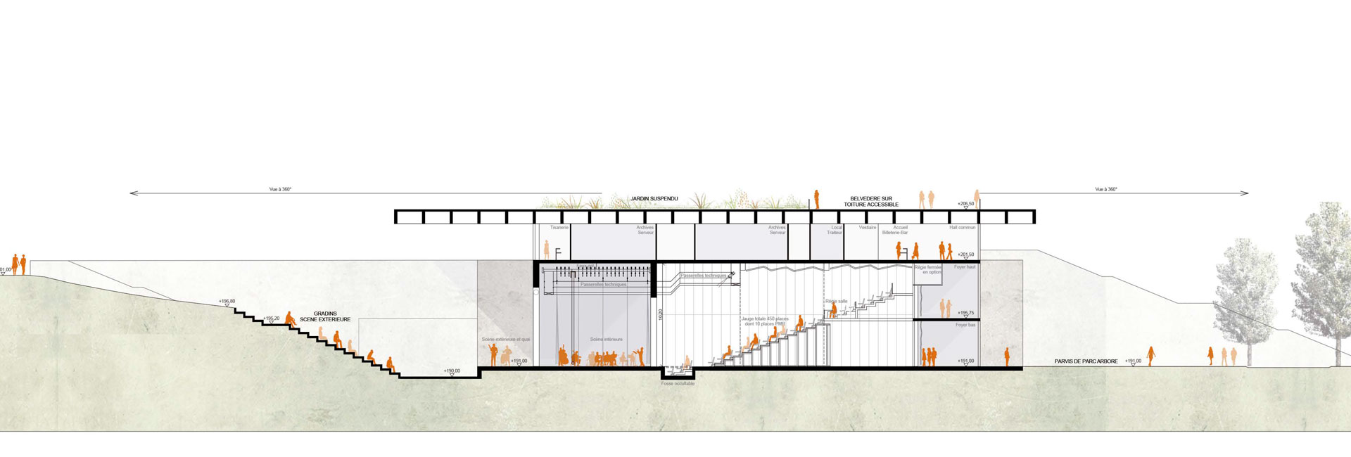 La salle polyvalente est quant à elle traitée en système tout air par le haut permettant une flexibilité maximale de configurations différentes : de la salle gymnastique à faible occupation, divisible pour accueillir deux activités à la fois, à une configuration de concert avec 400 places assises et une scène qui peut s’ouvrir sur les berges. Sa façade se caractérise par des panneaux de verre tout hauteur côté berges associés à des protections solaires en bois extérieures et un rideau d’occultation intérieur. Des ouvrants de ventilation en façade permettent un fonctionnement naturel en mi-saison et été.