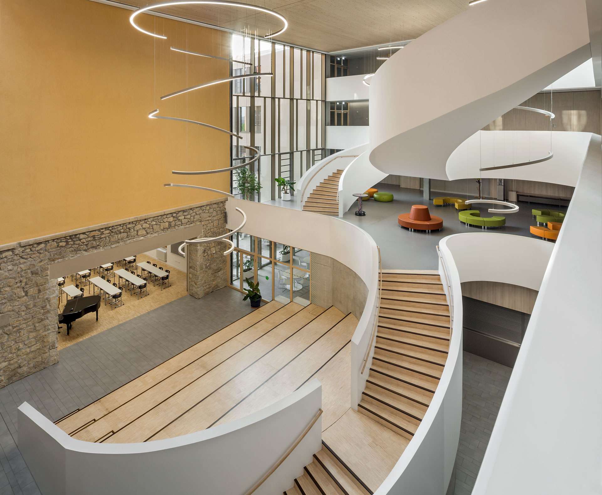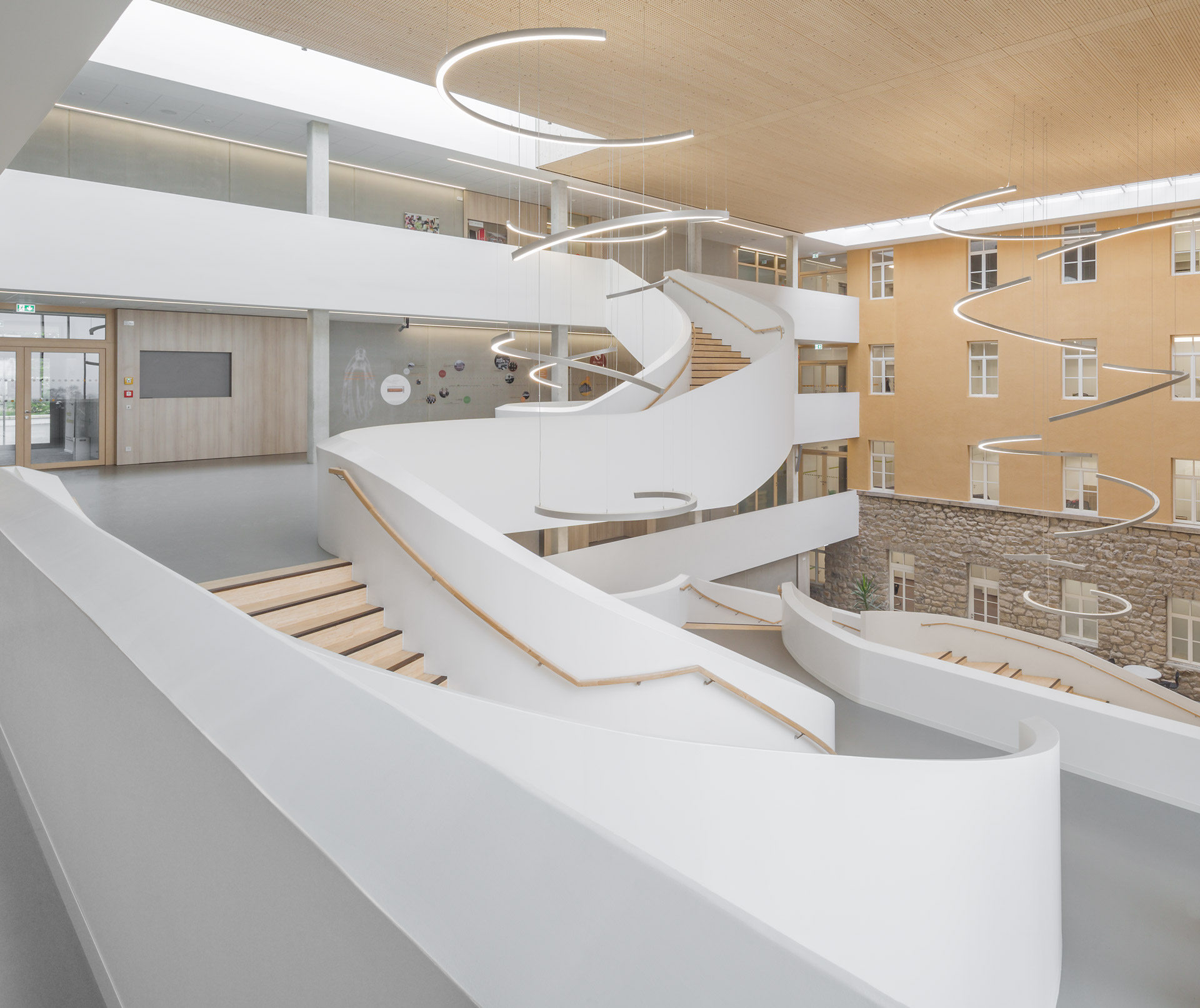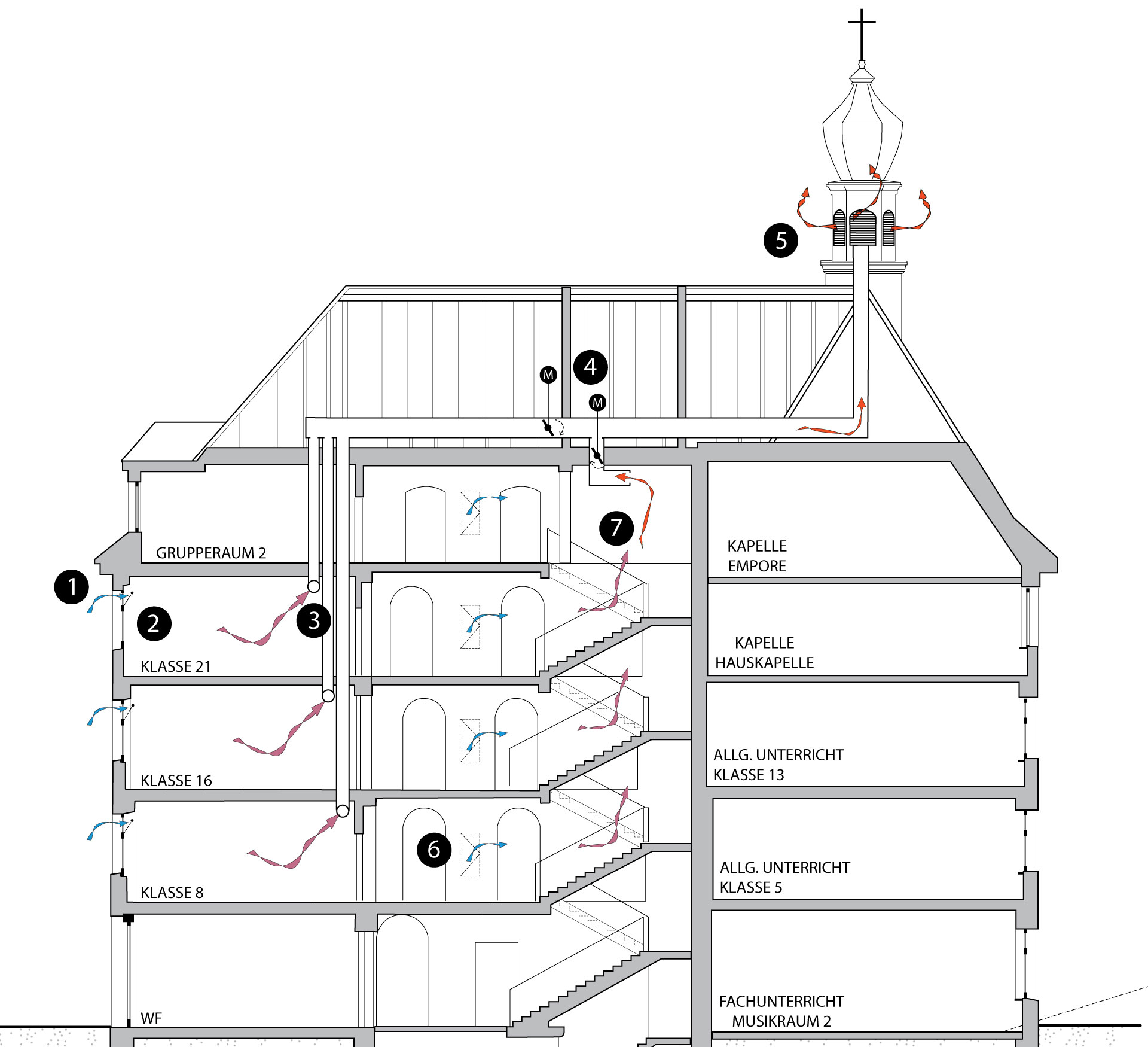 Ces conduits se rejoignent sur le toit et continuent jusqu’au clocher de l’ancien bâtiment, où l’air est définitivement extrait. Le système est donc une version contemporaine d'une « ventilation berlinoise », car ici des lucarnes motorisées contrôlent l’arrivée de l'air frais. La régulation de l’ouverture des lucarnes est centralisée, mais elle peut être outrepassée individuellement dans chaque classe. Ceci est particulièrement important en hiver pour minimiser les éventuels courants d'air froids. En été, la ventilation nocturne combinée à la masse thermique du plafond permet de réduire les températures diurnes dans les salles de classe. Plus de 60% de la surface du plafond est laissée libre (sans plafond suspendu), afin de tirer au maximum profit de la masse thermique du plafond et ainsi de renforcer l’efficacité de la ventilation nocturne.