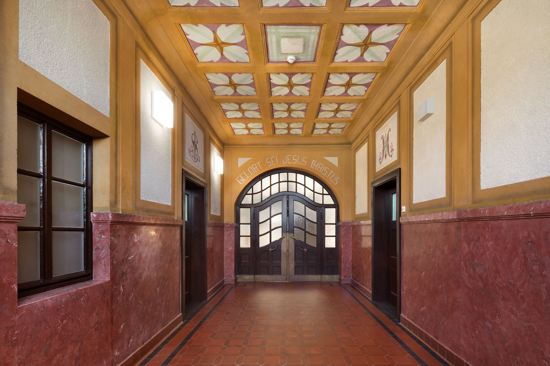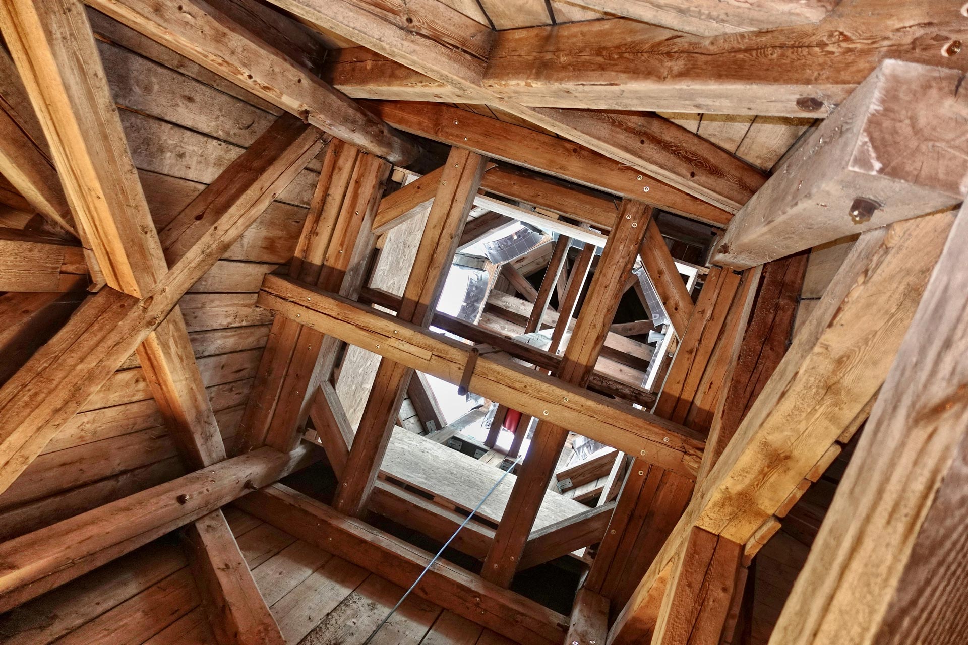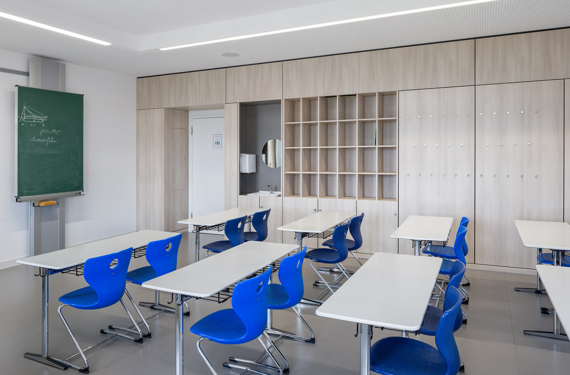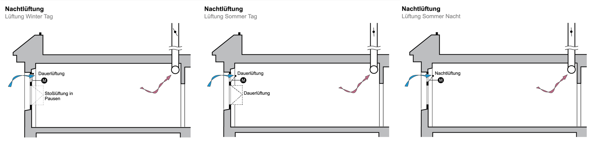 Ces conduits se rejoignent sur le toit et continuent jusqu’au clocher de l’ancien bâtiment, où l’air est définitivement extrait. Le système est donc une version contemporaine d'une « ventilation berlinoise », car ici des lucarnes motorisées contrôlent l’arrivée de l'air frais. La régulation de l’ouverture des lucarnes est centralisée, mais elle peut être outrepassée individuellement dans chaque classe. Ceci est particulièrement important en hiver pour minimiser les éventuels courants d'air froids. En été, la ventilation nocturne combinée à la masse thermique du plafond permet de réduire les températures diurnes dans les salles de classe. Plus de 60% de la surface du plafond est laissée libre (sans plafond suspendu), afin de tirer au maximum profit de la masse thermique du plafond et ainsi de renforcer l’efficacité de la ventilation nocturne.