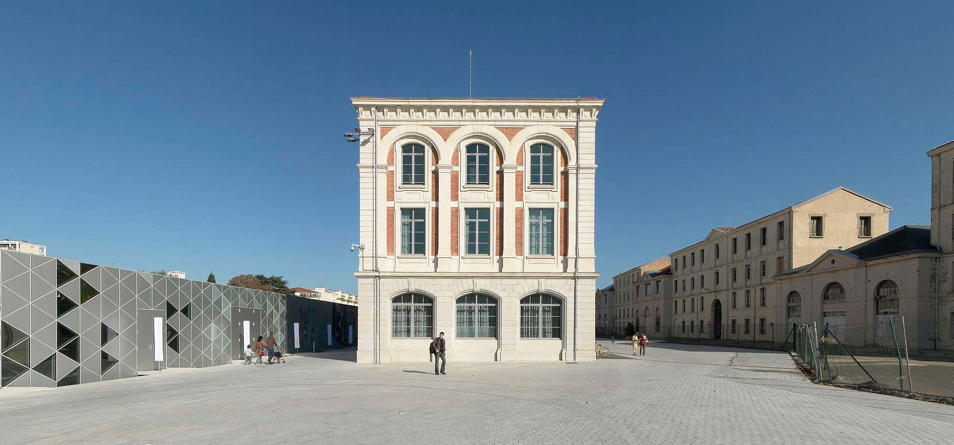 La Platine est un équipement tout en longueur, bas, et légèrement convexe. Il a pour vocation d’abriter les espaces de réception, de consultation, d’exposition, la cafétéria, l’auditorium et l’amphithéâtre. La clé de voûte du concept énergétique est réalisée par la conception innovante de la peau du bâtiment. Ses fonctionnalités sont multiples, permettant la ventilation, améliorant le confort thermique via la protection thermique des zones ainsi que le confort visuel via la gestion de la lumière naturelle et participant à la production énergétique. Le vide sanitaire du bâtiment intègre un puits canadien permettant de pré-conditionner de façon passive l’air neuf distribué au sein des différentes zones. Un système thermodynamique géothermique complète la performance énergétique du projet. Au-delà des propriétés d’enveloppe thermique protectrice, les différents panneaux de la couche extérieure permettent de moduler les apports lumineux et solaires dans les diverses zones suivant les besoins ad hoc. La peau ne se contente pas de filtrer la lumière, elle permet son absorption et sa transformation en énergie et régule également les échanges d’air et de chaleur. La ventilation naturelle du bâtiment, le chauffage et le refroidissement via un plancher réversible chauffant/ rafraîchissant ainsi que la surface intérieure de l’enveloppe à faible émissivité (couche low E) permettent d’accroître le ressenti de confort thermique des occupants. La couche à faible émissivité des parois intérieures permet de réfléchir l’énergie dissipée par la plancher chauffant/ rafraîchissant, tel un miroir thermique, participant alors à un accroissement du ressenti du confort thermique des occupants et à une réduction des consommations énergétiques. Sous la Platine est mis en œuvre un système géothermique via l’activation thermique des pieux de fondation, de l’utilisation d’un puits canadien pour pré-conditionner l’air neuf et les échanges aérauliques entre les zones visant la réduction des consommations énergétiques.