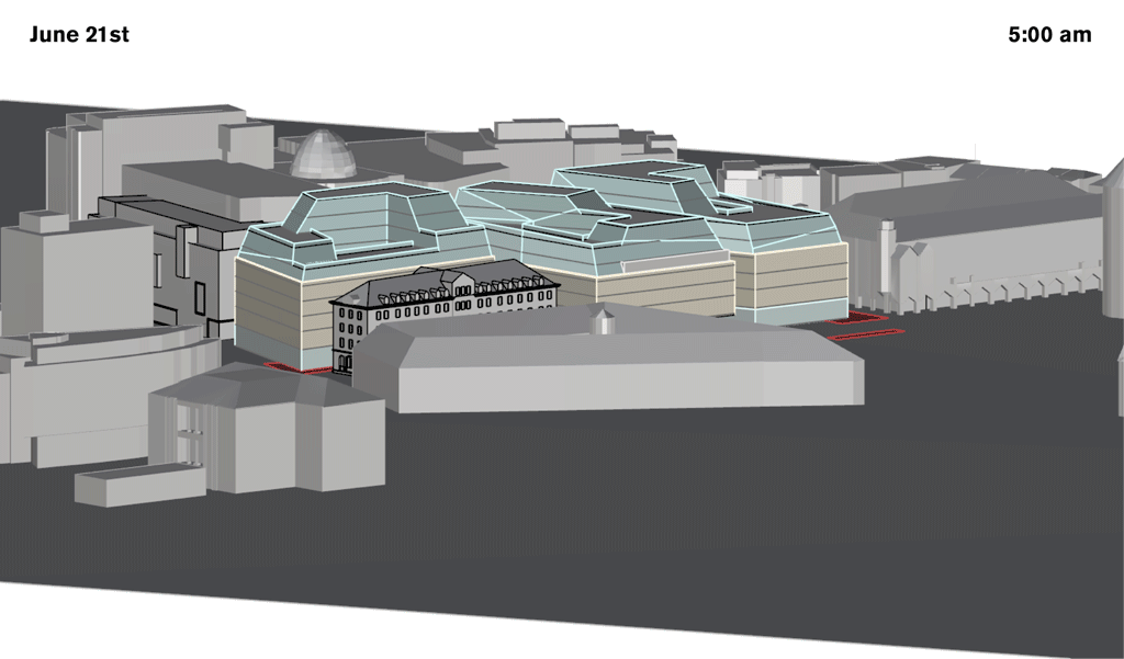 Pour le «Dorotheen-Quartier», les études d’ensoleillement et d’ombrage sont à la base de la conception des toitures, contribuant à la forme du toit, au taux de surface vitrée de la façade et au choix des matériaux. Le vitrage vertical des combles est fritté, ce qui permet d’assurer une quantité de lumière du jour optimale pour les espaces de bureaux, et de réfléchir les rayons solaires comme lumière diffuse, améliorant ainsi l’éclairage des cours intérieures et des ruelles. Un accent particulier est mis sur l’accès à la lumière du jour à l’intérieur et à l’extérieur afin d’éviter le problème classique des espaces urbains sombres.