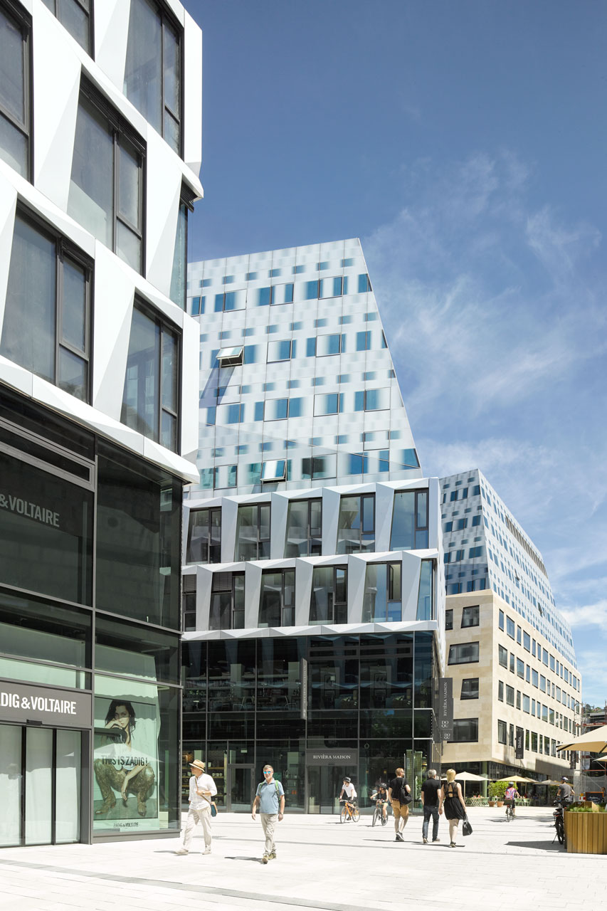 Le nouveau «Dorotheen-Quartier» se compose de magasins, de cafés et de restaurants, de bureaux ainsi que d’appartements avec parking souterrain pouvant accueillir 350 véhicules. L’objectif était de créer un centre-ville vivant avec des façades attrayantes de haute qualité sur tous les côtés. L’échelle, la forme et la conception des trois nouvelles constructions s’intègrent parfaitement dans la structure urbaine existante. A Stuttgart, tous les bâtiments disposent d’une «cinquième façade» grâce à la topographie unique de la ville: la toiture. Le traitement des toitures revêt une signification particulière dans un endroit où tout point d’observation offre une vue sur les toits iconiques.