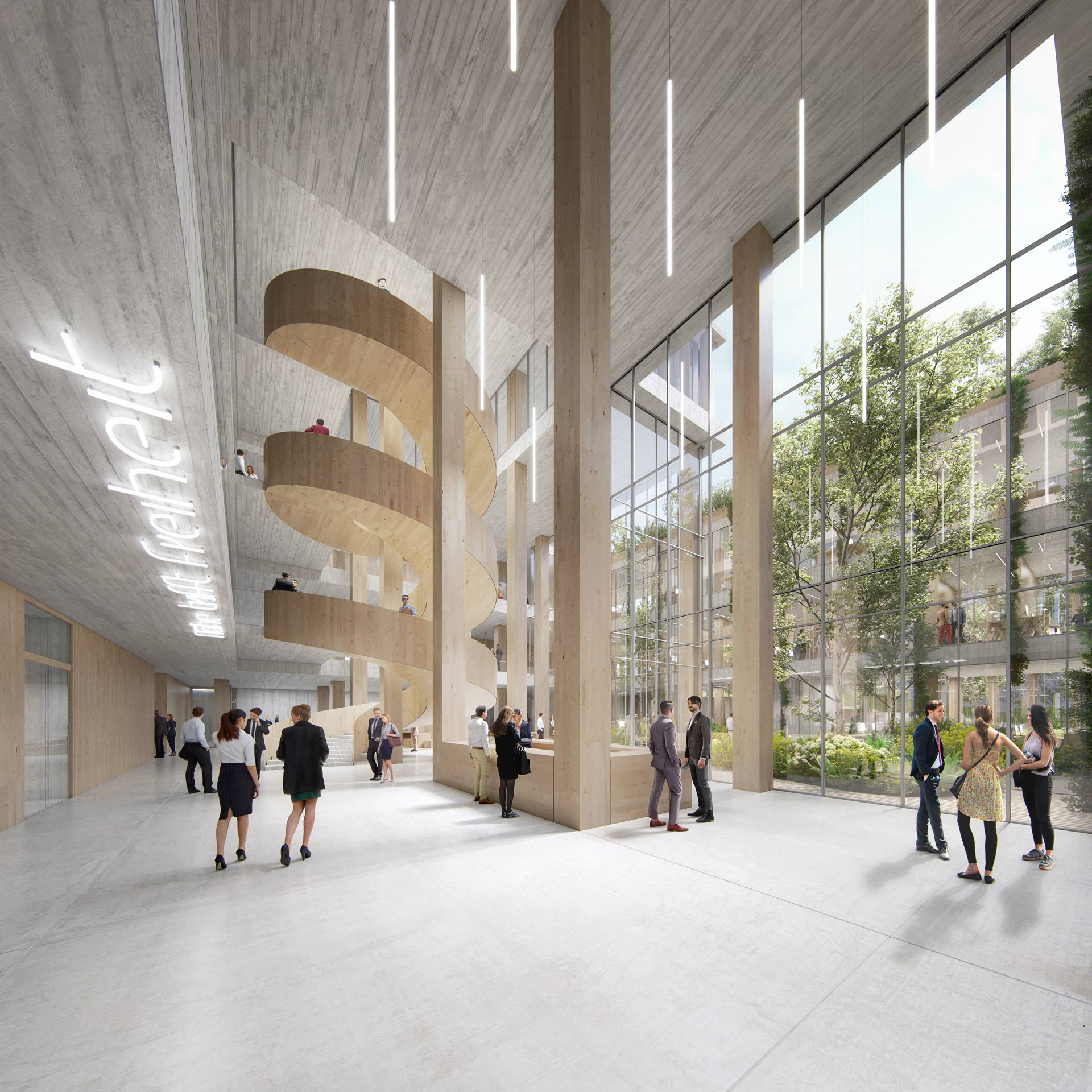 The building design, the concepts for climate and energy and the building materials aim for the lowest possible CO2 footprint. The use of local energy is a determining criterion of the energy concept. Local and renewable sources are used intensively: The sun is used to generate electricity via façade and roof-integrated photovoltaics, combined with geothermal energy via activated piles and local heating / local cooling. The base load of heating is covered by a heat pump via the activated piles; the peak load is covered by local heating. This approach maximizes the use of renewable sources while reducing technical space in the building.