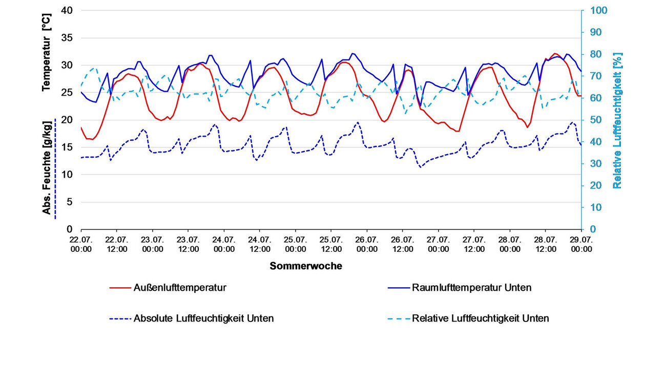 Le matin, la ventilation naturelle est d'abord utilisée, puis le système de brumisation est mis en marche pour maintenir la température intérieure proche de la température extérieure. L'humidité augmente au cours du processus, indiquée sur le diagramme en humidité absolue (généralement mesurée en grammes par mètre cube g/m3). L'humidité relative est mesurée en pourcentage et se situe de manière optimale autour de 70 % dans la maison de la jungle. Vers 20 heures, les fenêtres se ferment mais le système de brumisation est toujours activé afin d’atténuer les pics de températures à l'intérieur. La nuit, les fenêtres sont légèrement ouvertes.