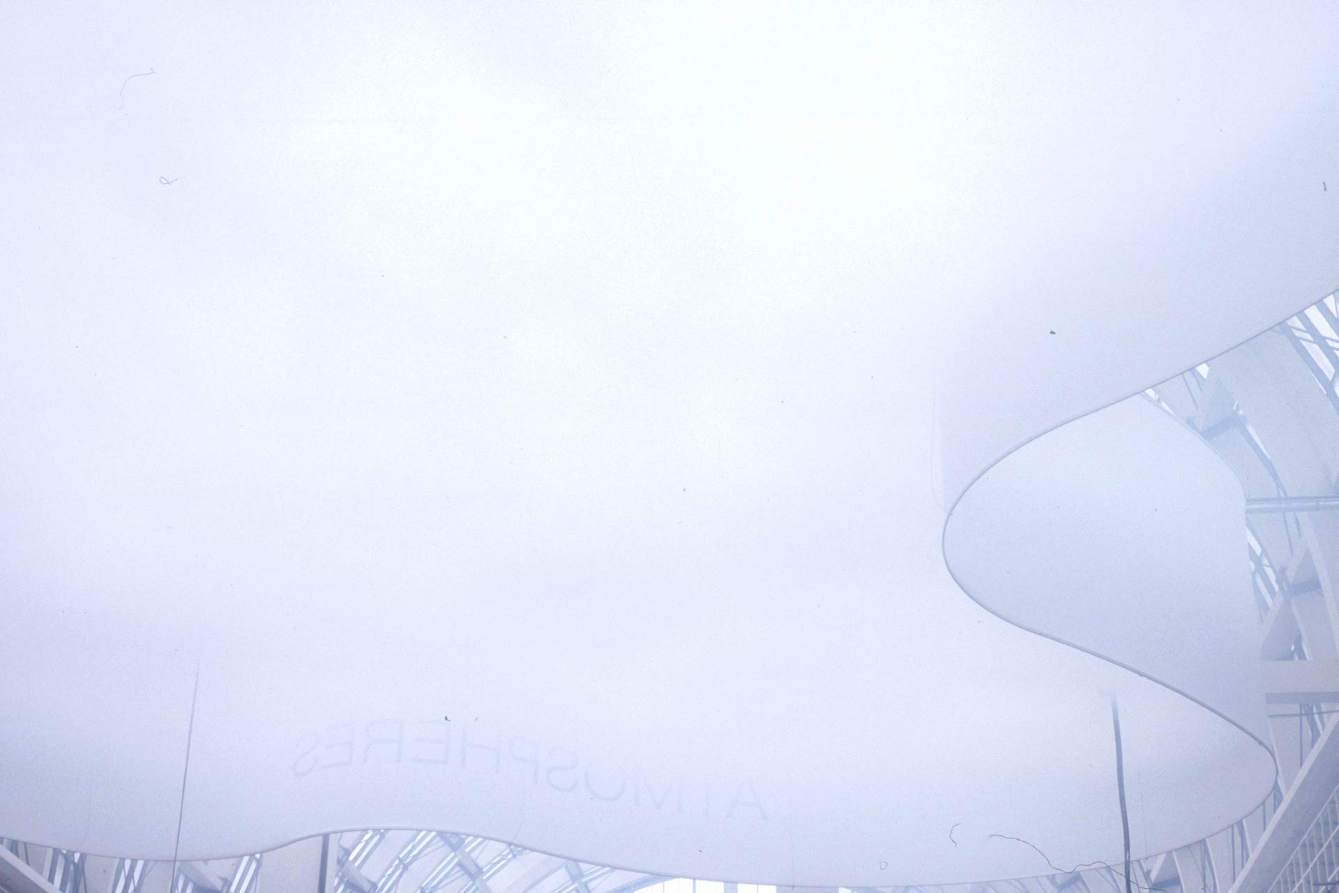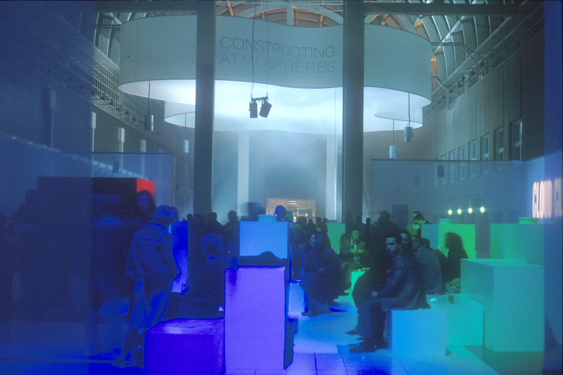 The objective was to create a stable indoor cloud as part of the show “Constructing Atmospheres” at the exhibition Light & Building / Aircontec 2002. Twice a day a several-hundred-cubic-meter-large cloud was generated from air layers of varying humidity and temperature inside the Galleria Frankfurt in a single-glazed linear atrium connecting wings of various exhibition spaces. By creating a stable temperature stratification within this large air volume, the induced saturated water vapor stayed within the given boundaries. At nightfall the Experimental Cloud has been transformed into an illuminated body hanging over the Cloud Club.