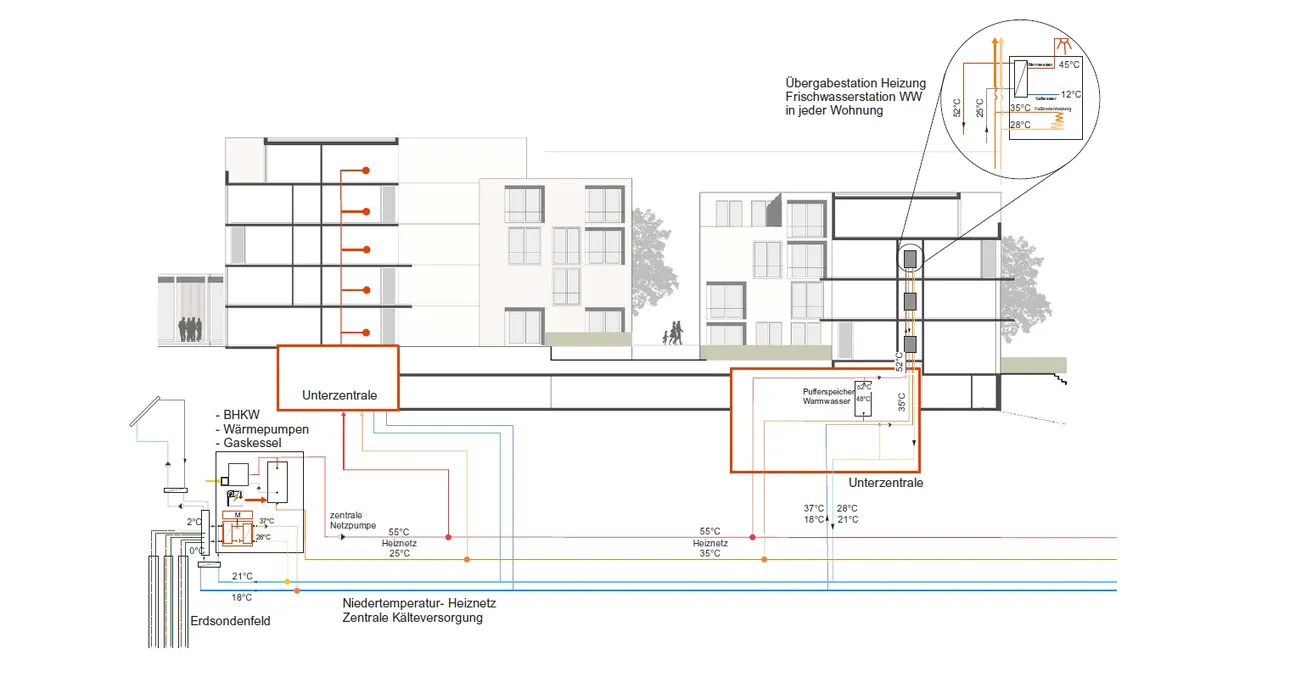 Solar thermal collectors also provide heating and domestic hot water heating energy, which enables the geothermal system to have a longer lifespan. The third heat source is a cogeneration unit, which also provides electricity to the development. Finally, peak loads are covered by a gas boiler.
