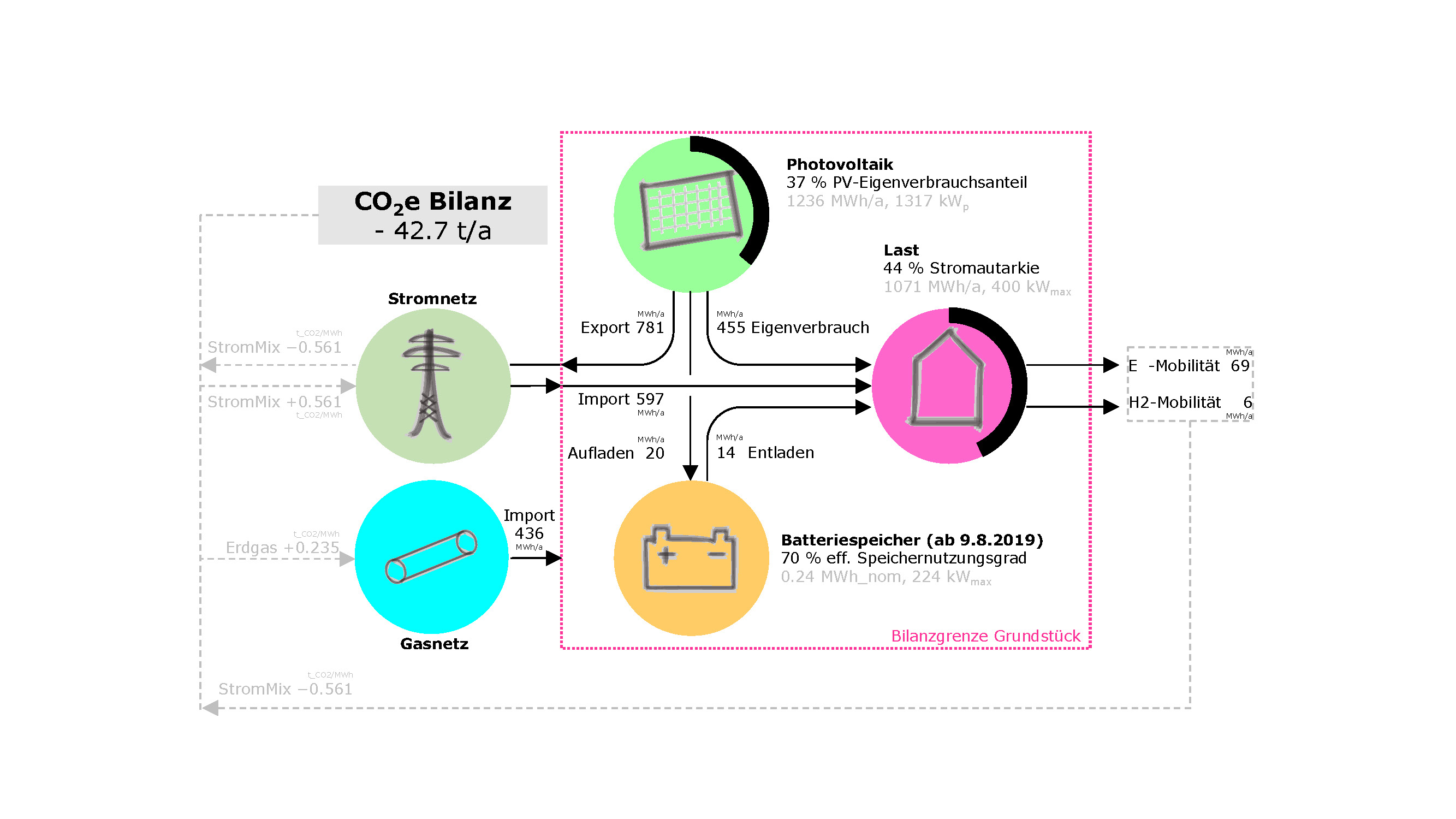Dans le bilan énergétique annuel, "la station-service du futur de Fürholzen West" fait plus qu'autofinancer son fonctionnement. Son exportation d'énergie vers le réseau public évite ainsi chaque année des tonnes CO2eq par rapport à une quantité correspondante d'électricité provenant du mix électrique allemand. Pour 2019, ce chiffre s'élève à -42,7 t.