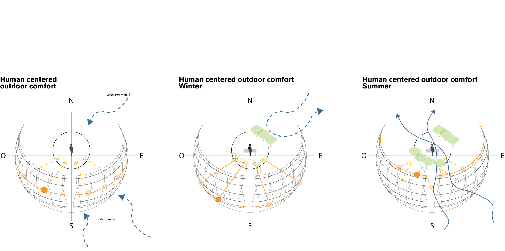 Ce qui empêche le soleil de pénétrer pendant les jours et les heures les plus chauds ne doit pas bloquer la brise venant du sud et du sud-est. Ici, la végétation haute est idéale pour s'asseoir et se reposer. En hiver, pour tirer de l’ensoleillement direct sur le confort thermique et ainsi créer des zones confortables, des arbres à feuilles caduques sont choisis. La vitesse du vent en hiver doit être limitée, c'est pourquoi des barrières vertes de faible hauteur mais de forte densité sont également mis en œuvre. Les études de Transsolar analysent le rayonnement solaire et permettent de tirer des conclusions sur la taille et la localisation des zones de confort et sur les changements au cours de l'année.