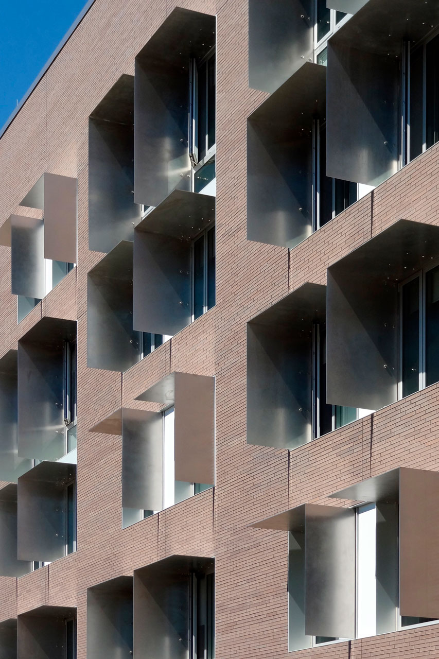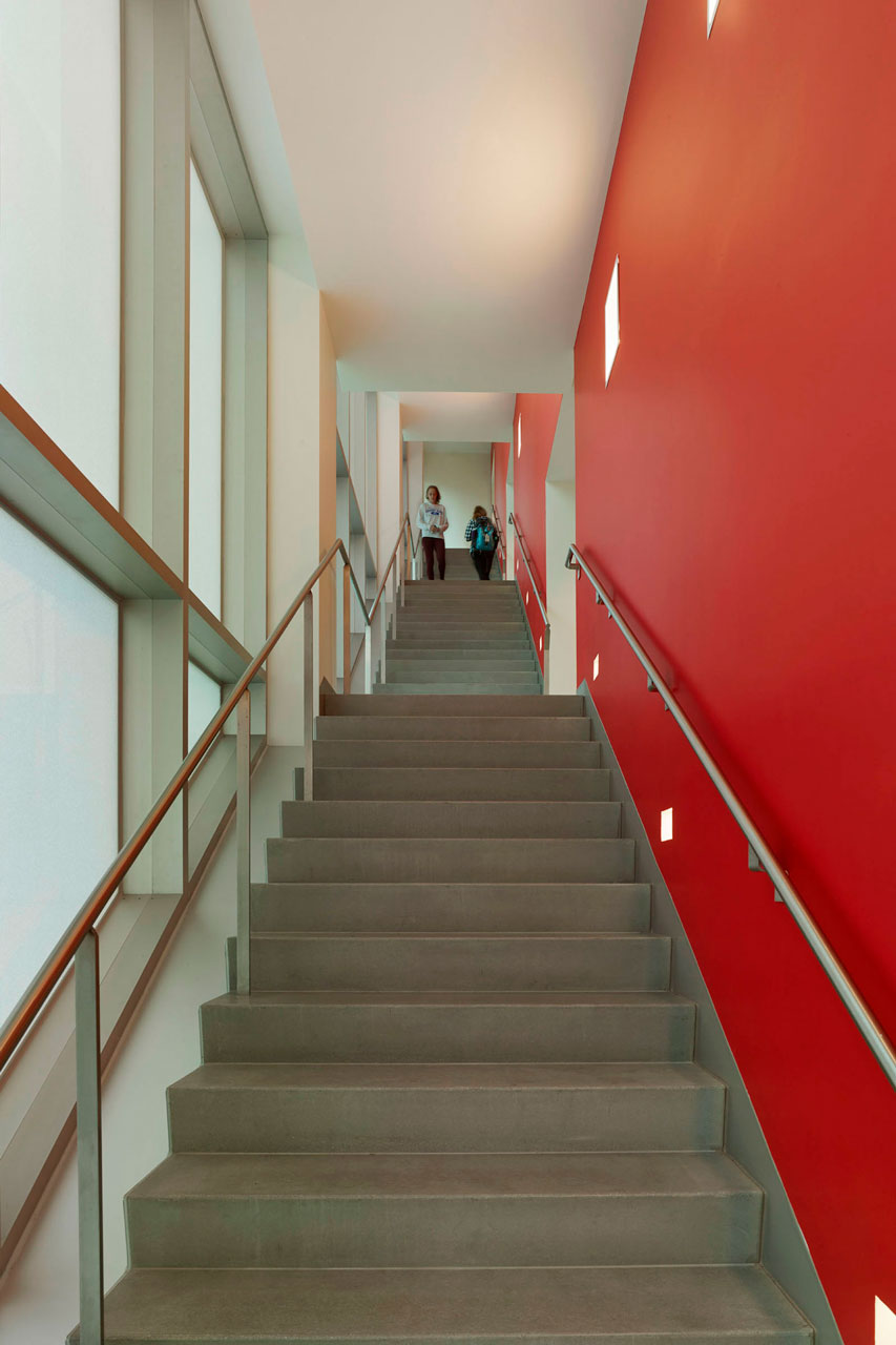 «Greenway Residence Halls» est constitué de quatre immeubles, proposant des logements variés pour environ 300 étudiants. Les immeubles sont reliés entre eux par des ponts et disposent de cuisines tout équipées, de salles d’études en duplex, d’un espace événementiel polyvalent et de salles de conférence. Le projet met l’accent sur une conception basse-consommation, visible et tangible pour les résidents, afin de les y sensibiliser. Les habitations sont quasiment toutes exposées plein sud et offrent une vue dégagée sur la nature environnante. Elles bénéficient ainsi des gains solaires passifs en hiver, tandis qu’une protection solaire fixe évite leur surchauffe en été et à mi-saison. Les cages d’escaliers se situent le long des façades nord et disposent de vitrages à isolation thermique renforcée et partiellement translucide . Leur conception claire et ouverte vise à inciter les étudiants à prendre les escaliers au lieu de l’ascenseur. Au printemps et en automne, les espaces communs sont ventilés naturellement via les cages d’escaliers. En combinant la ventilation naturelle via des ouvertures manuellement contrôlables et la masse thermique des murs et plafonds en béton apparent, un confort thermique exceptionnel est atteint durant la majeure partie de l’année sans faire appel au chauffage ou à la climatisation. Lors de conditions extérieures extrêmes, l’activation thermique des dalles béton en combinaison avec une ventilation mécanique minimale garantissent un climat intérieur agréable. Une récupération de chaleur sur l’eau grise des douches réduit les besoins de chauffage de l’eau chaude sanitaire, généralement hauts dans les résidences universitaires.