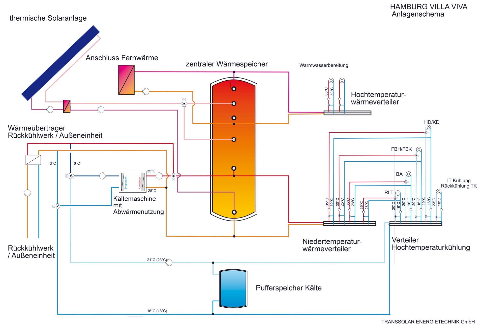 A heat pump is mainly used as a chiller and its waste heat is utilized. A considerable proportion of Villa Viva's energy requirements is used to heat the domestic hot water, which is necessary all year round. Here, an important element supports the energy and climate concept by capturing solar heat: a solar thermal system. This requires a buffer storage tank. For this project, the design team deliberately decided not to install the storage tank discreetly, but to place it visibly in the atrium. It refers to the environmentally friendly technology in the building and is a sign that it is possible and meaningful to install such a system in a mixed-use building in the city center.