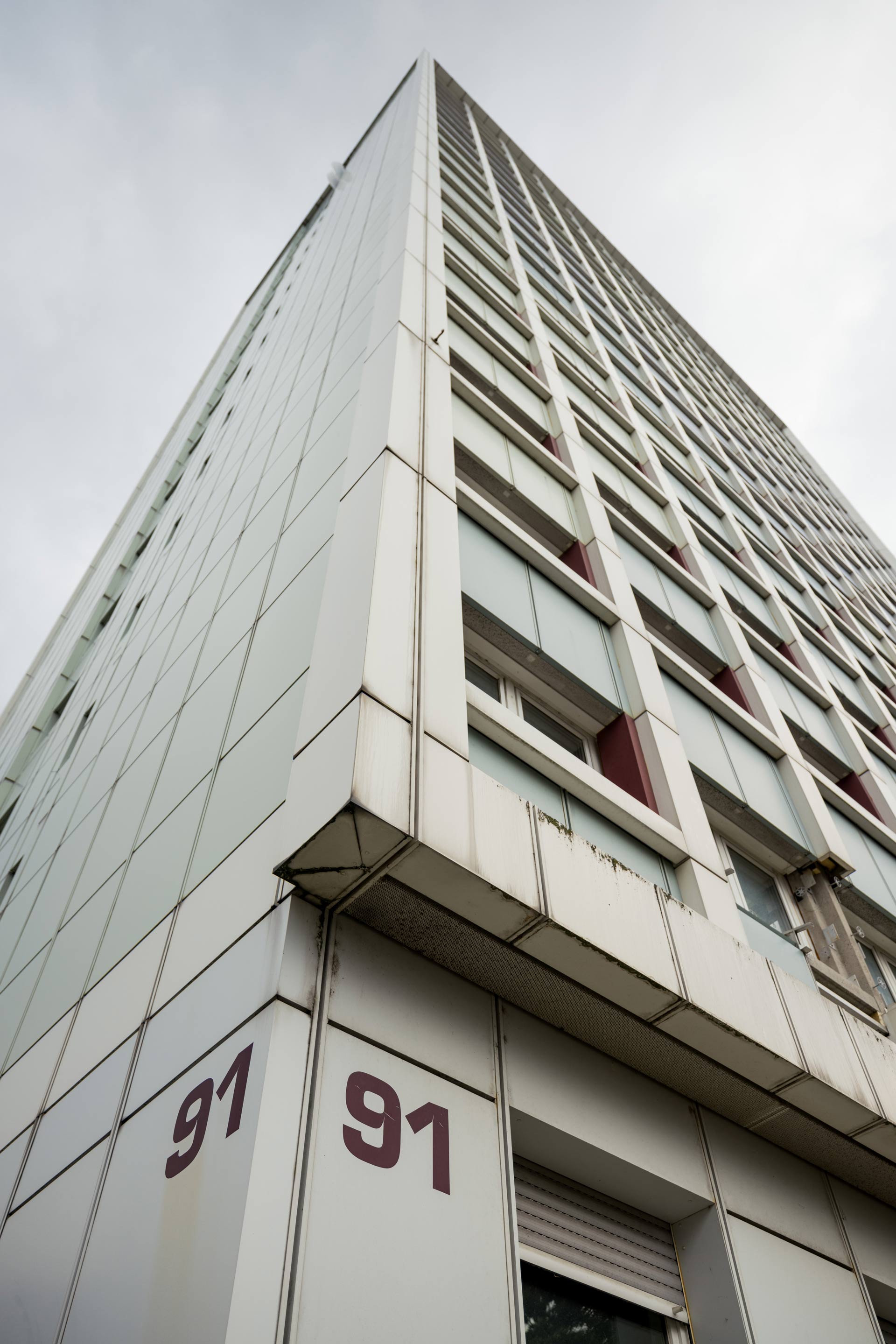 A residential high-rise building from 1963 is undergoing extensive modernization. First, hazardous materials such as asbestos must be removed, followed by updating the building's fire safety and energy efficiency.