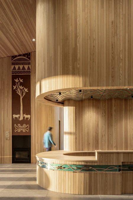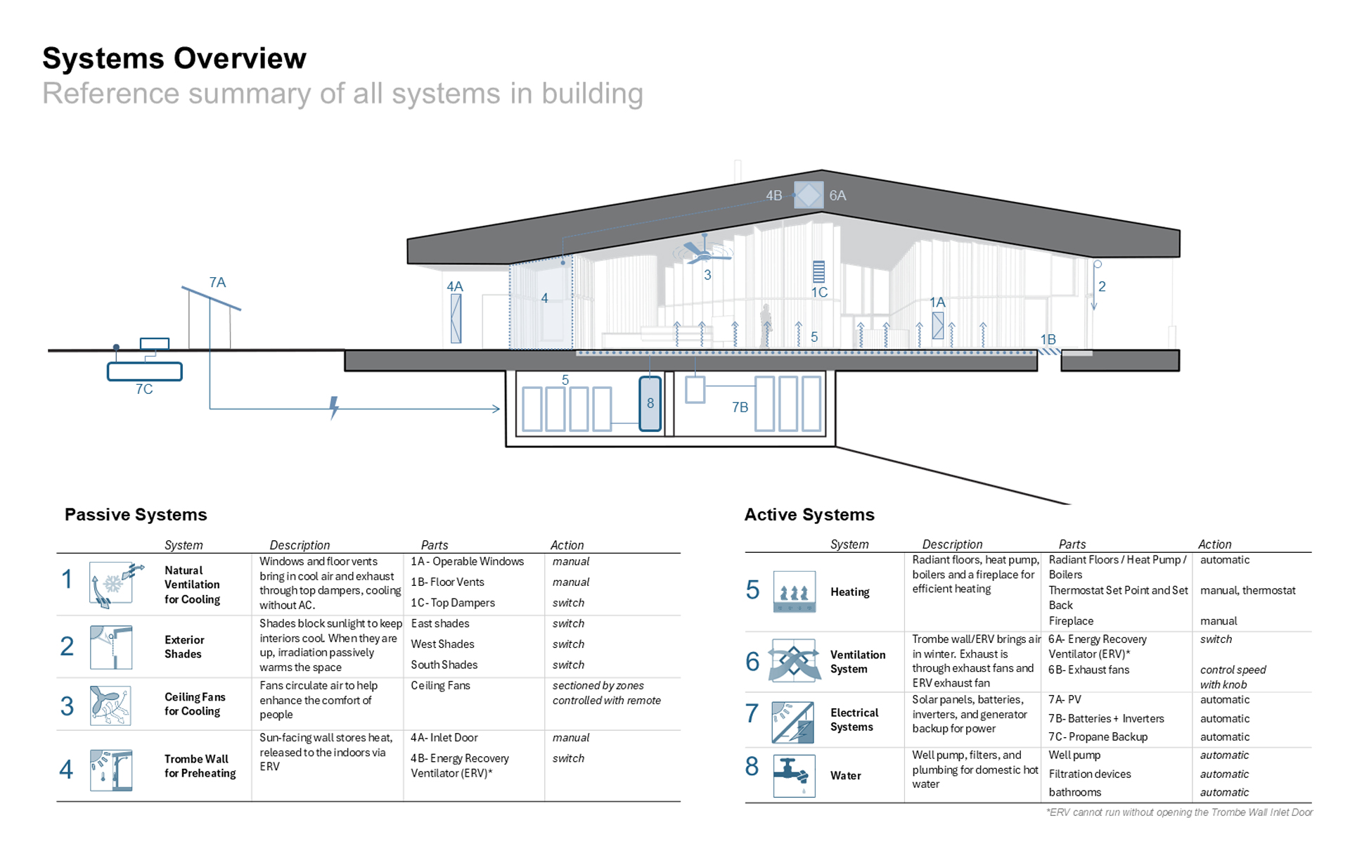 Il n'y a pas de refroidissement actif ; tous les besoins de refroidissement sont couverts par des stratégies passives, y compris la ventilation naturelle, le refroidissement par surventilation nocturne, la masse thermique, l'ombrage extérieur et les ventilateurs plafonniers. Le bâtiment a non seulement une très faible empreinte carbone opérationnelle, mais il est également respectueux de l'environnement grâce à sa structure en bois massif.