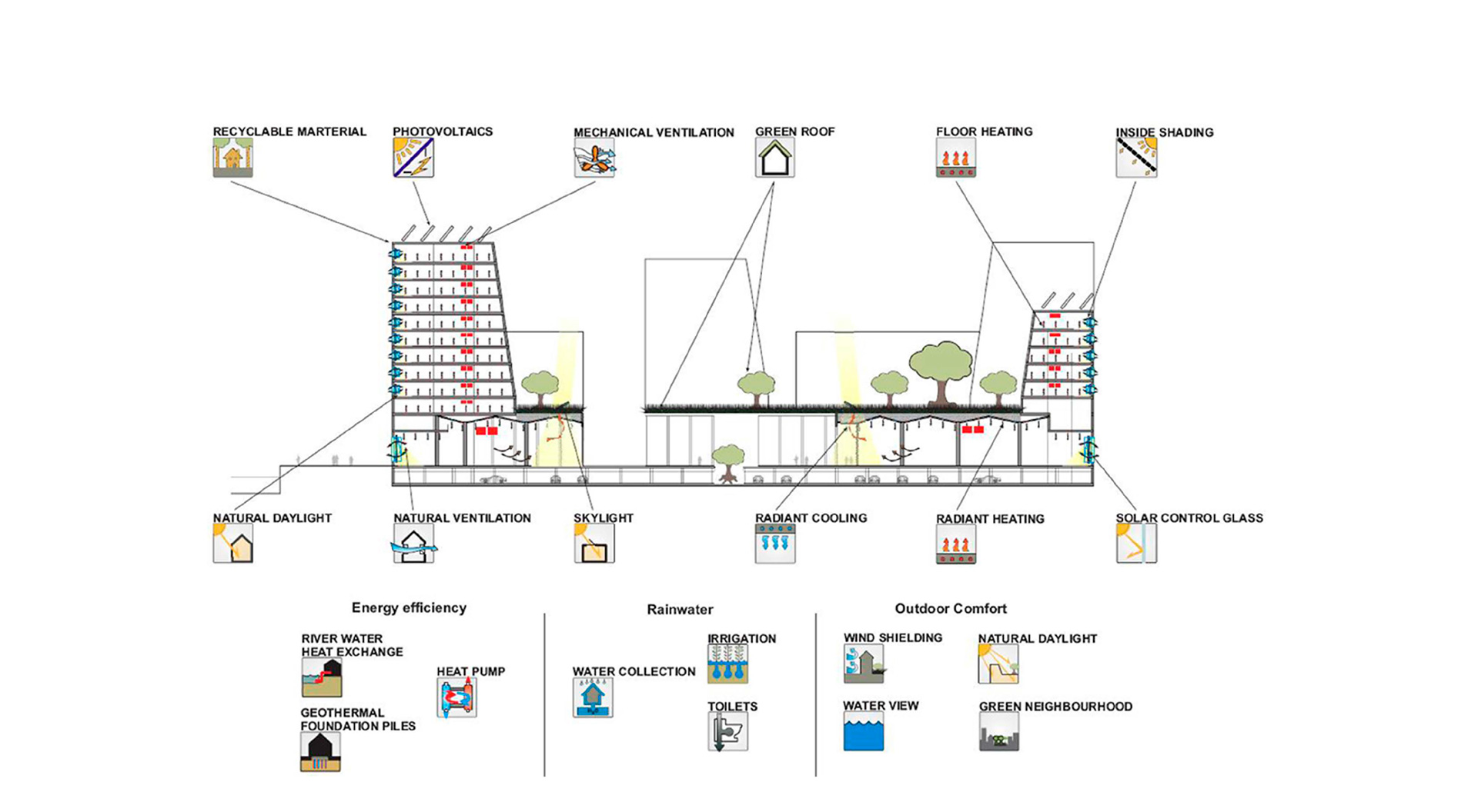 The clients goal was to create a highly sustainable development. Transsolar supported the design team during the competition and early design phase in developing the concept and optimizing the massing of the masterplan with the goal to maximize indoor and outdoor comfort, passive measures and to reduce the resource demand for building operation to a minimum.