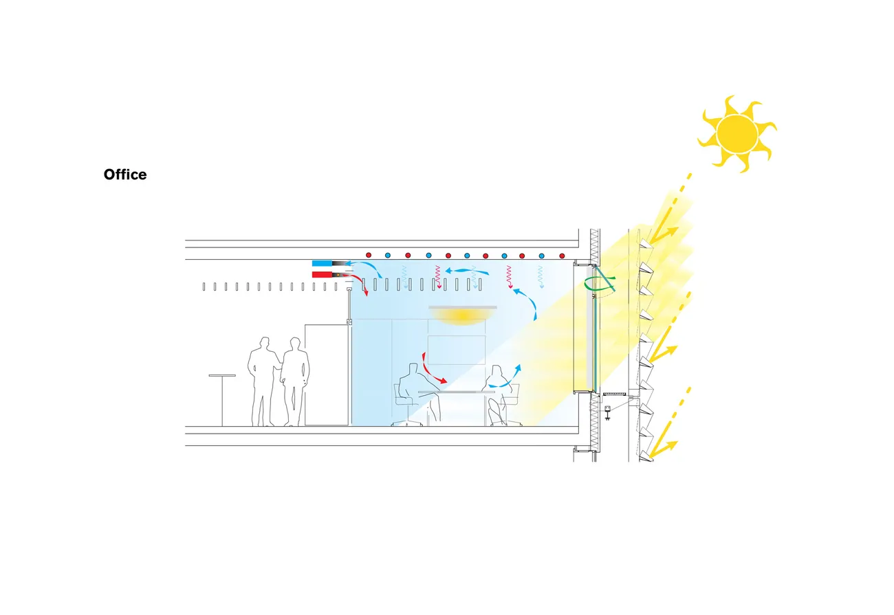 Le chauffage et le refroidissement des bureaux et des zones de travail sont assurés par des dalles actives en béton. Les utilisateurs peuvent également contrôler individuellement le climat de la pièce, à l’aide d'un petit radiateur réglable sur la sortie d'air et de fenêtre ouvrantes en façade.