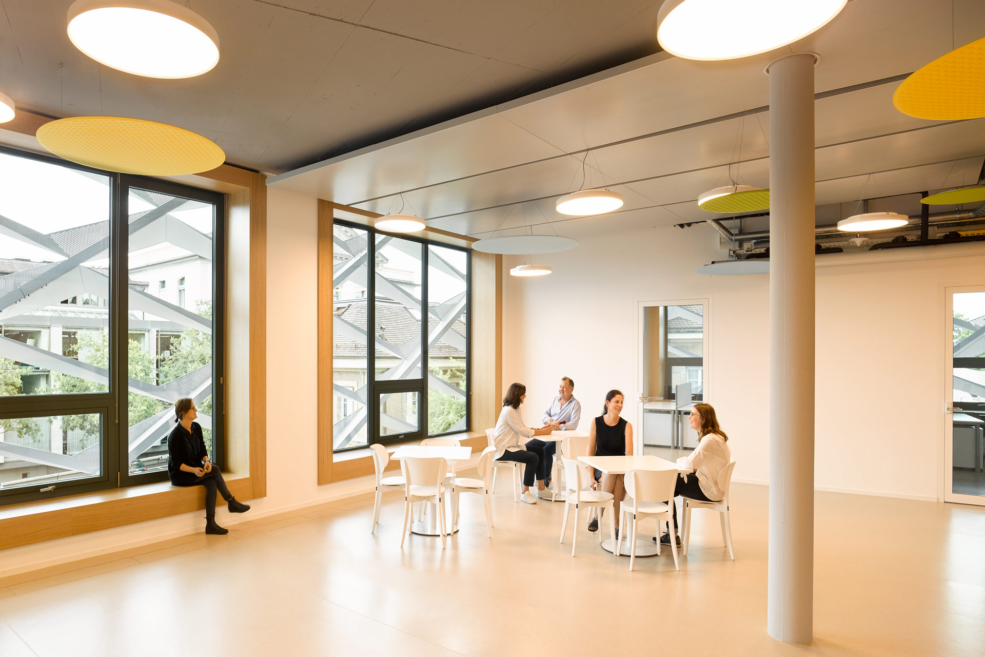 Des vitrages spéciaux et une protection anti-éblouissement interne complètent la protection contre un excès de soleil et de chaleur dans les pièces. La ventilation naturelle (ventilation hybride) de toutes les pièces non-laboratoires permet non seulement d’assurer l’apport hygiénique en air frais, mais également la ventilation nocturne des pièces. Dans toutes les pièces non-laboratoires, les plafonds massifs sont complètement apparents, afin de leur permettre d’absorber les charges thermiques.