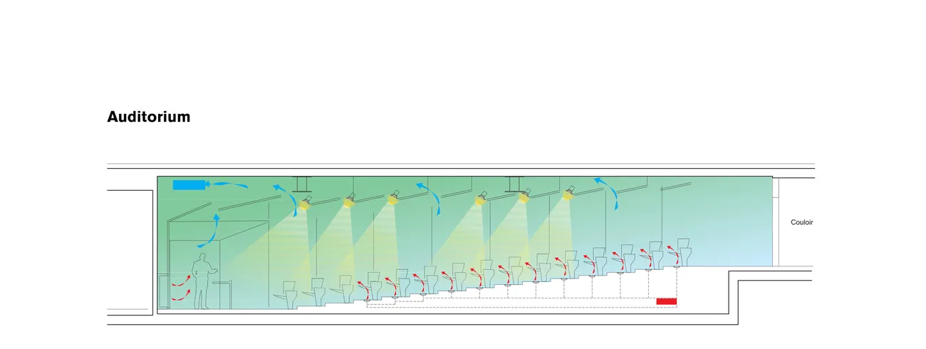La ventilation hybride dans toutes les pièces (hors laboratoire) possédant un accès à la façade réduit le besoin en ventilation mécanique dans ces zones. Dans les laboratoires, la ventilation mécanique est réduite aux exigences hygiéniques de renouvellement d’air et contrôlée par des capteurs en CO2. Un système de pompe à chaleur réversible permet une récupération synergique de la chaleur des laboratoires vers les pièces hors laboratoire.