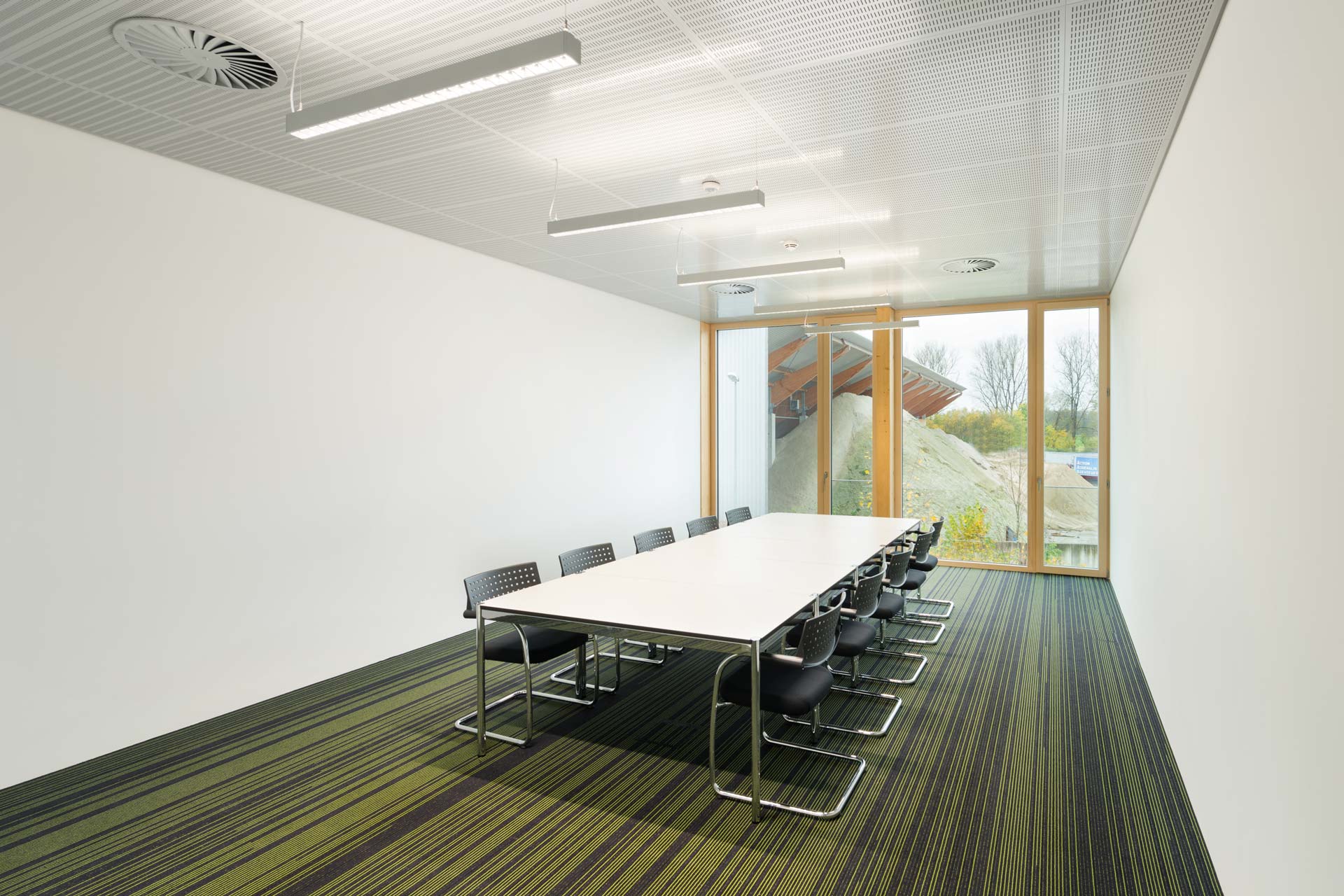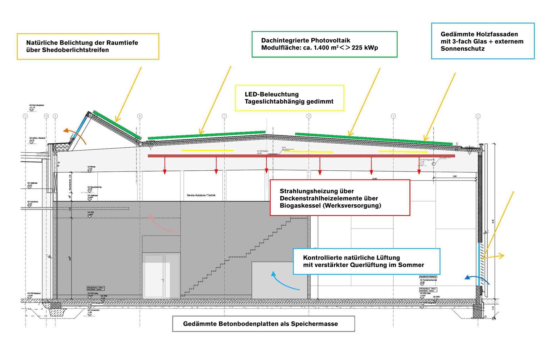 Les vitrages orientés nord dans les sheds du toit du hangar et la protection solaire réglable dans les bureaux et le hall permettent une utilisation optimisée de la lumière du jour et minimisent la demande en énergie pour l'éclairage artificiel. Un éclairage LED est utilisé dans tout le bâtiment et est gradué lorsque cela est possible.