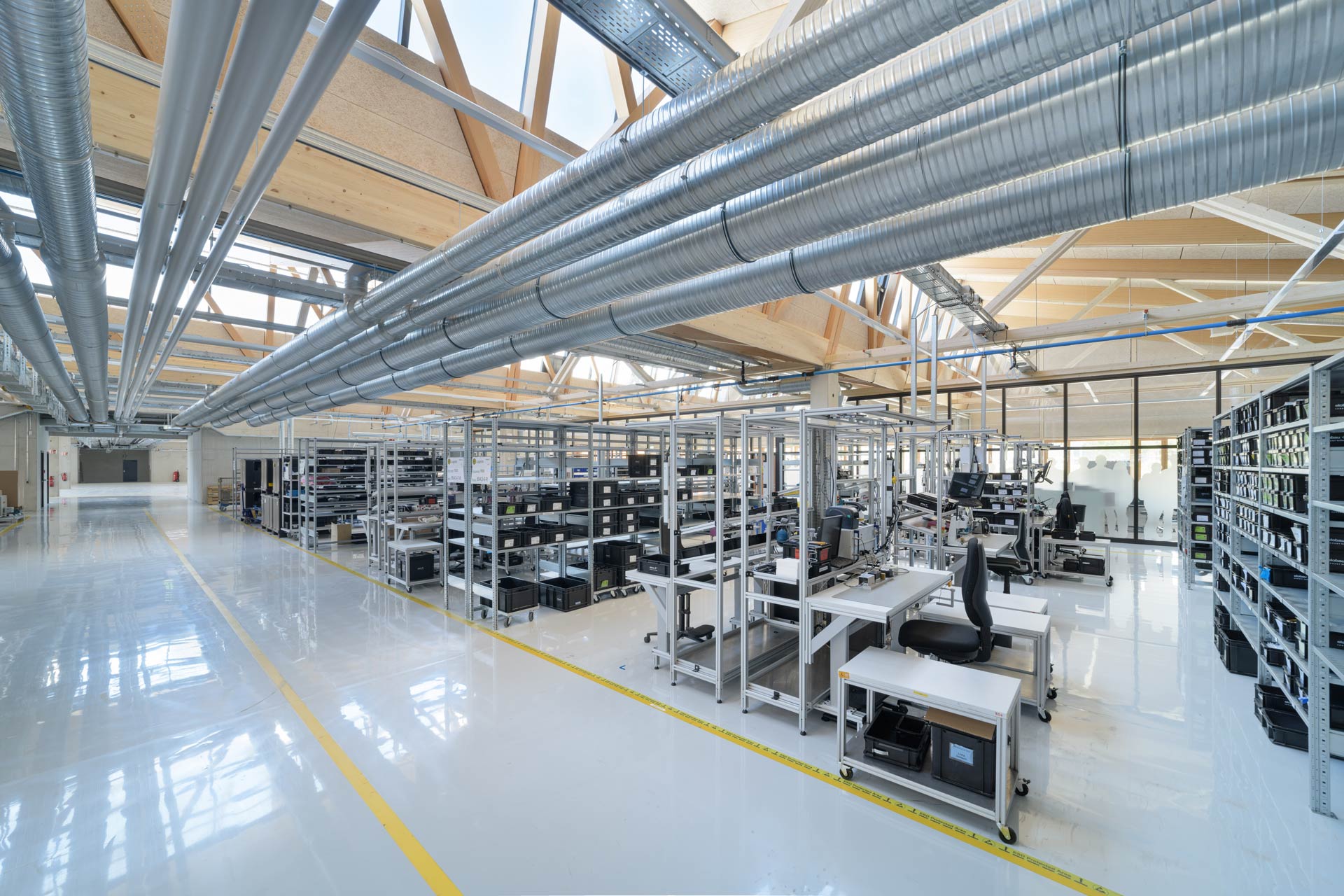 Le toit à dix sheds caractérise la structure du bâtiment ; les ouvertures zénithales sont orientées vers le nord et assurent un apport optimal de lumière naturelle. Le hall est conçu pour une utilisation flexible et convient aussi bien aux postes de travail de production qu'aux bureaux.