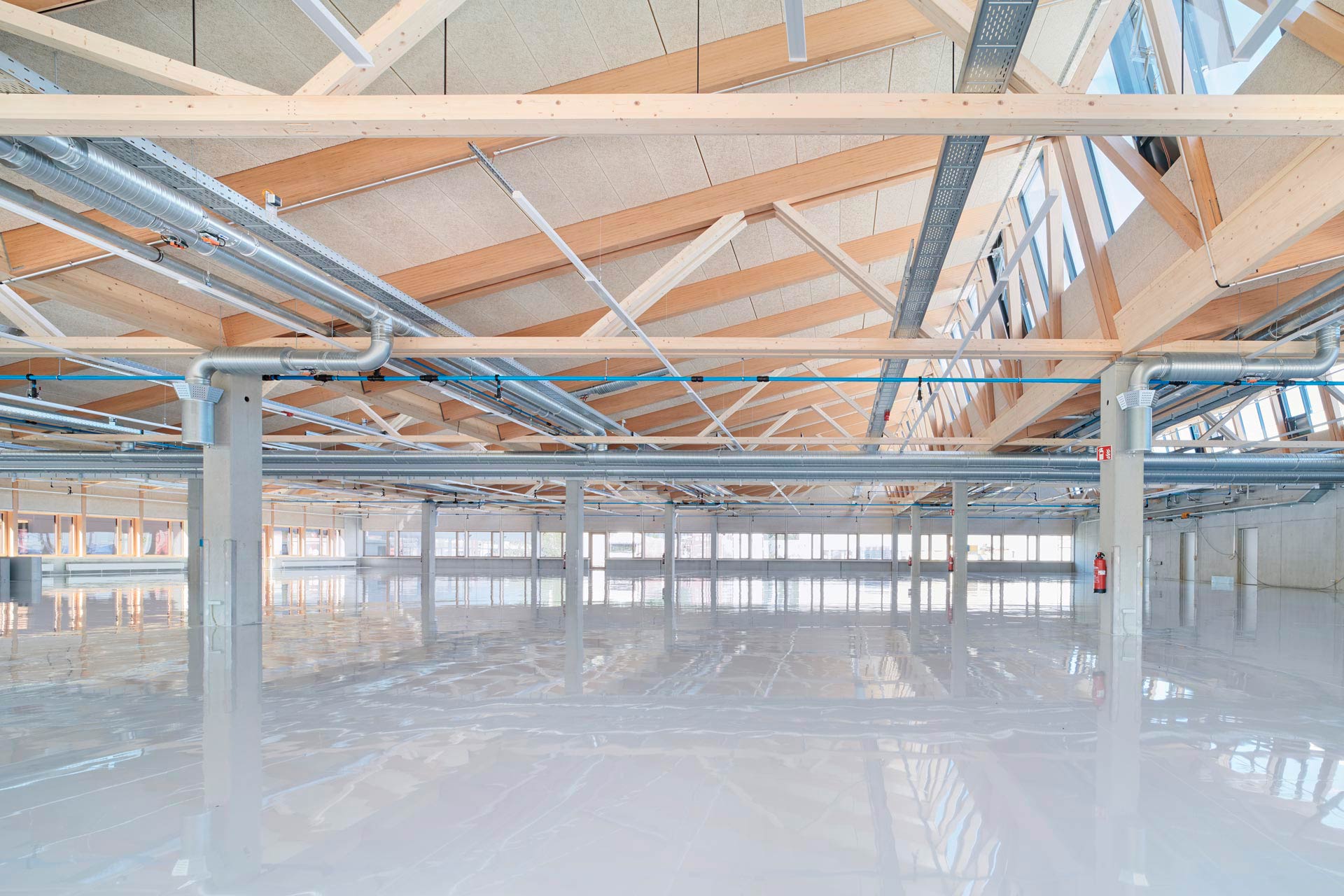 Un système de ventilation mécanique efficace assure le renouvellement d'air minimal nécessaire sur le plan hygiénique, tandis que le système de chauffage et de refroidissement par le sol permet de réguler la température. La chaleur est fournie par une pompe à chaleur à air. L'énergie électrique nécessaire au fonctionnement et à l'utilisation du bâtiment est produite par une large installation photovoltaïque sur les toits des hangars.