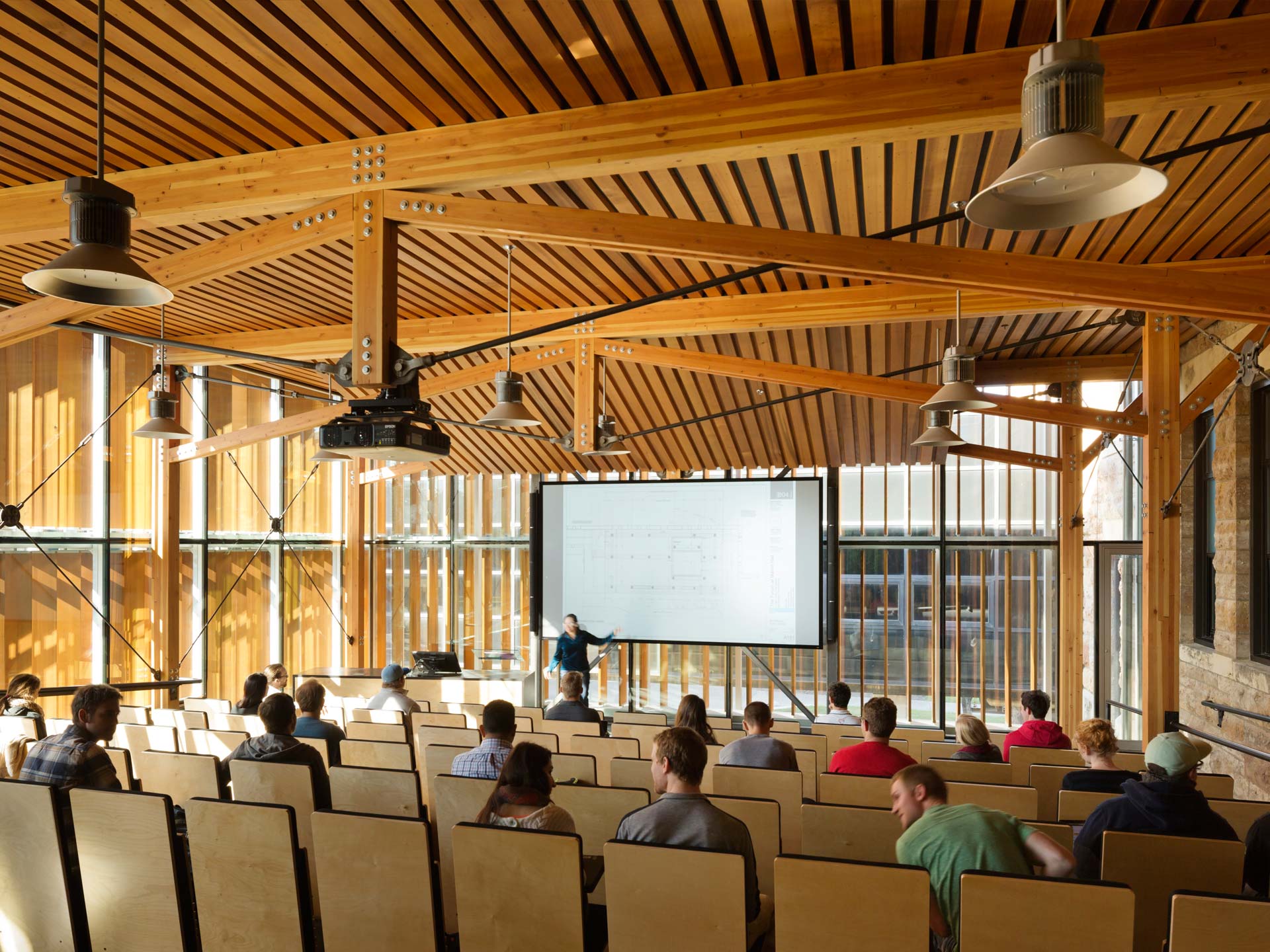 Le forum est un ajout au hall Marvin situé dans le bâtiment historique de l’école d’architecture de l’université du Kansas. Il satisfait les besoins critiques de l'école pour un espace central commun et un auditorium, qui n’étaient initialement pas présents dans le Marvin Hall. Il a été conçu et construit uniquement par les étudiants en architecture de troisième cycle et les participants de Studio 804, le département d'architecture du programme de conception/construction et avec le soutien de divers experts du secteur. Transsolar a servi de conseil quant à la conception et à l’intégration dans les concepts architecturaux des systèmes climatiques de la double façade et de la ventilation naturelle. La double façade est faite de deux murs séparables fait de verre isolant, distant de 1 mètre l’un de l’autre. L’espace intermédiaire permet l’insertion de persienne en cèdre. Des clapets motorisés sont situés en haut et en bas de la couche externe. Lors des jours doux, la ventilation mécanique s’arrête, les clapets s’ouvrent, et la ventilation naturelle transversale est utilisée pour apporter de l'air frais dans le volume directement depuis l’extérieur. Pendant les mois chauds lorsque le refroidissement est nécessaire, les deux clapets supérieurs et inférieurs s’ouvrent et permettent un effet de cheminée pour tirer l’air frais de la partie ombragée de la face inférieure du bâtiment et ainsi le ventiler vers l’extérieur par le sommet. En hiver, les ouvertures sont fermées, créant une couche tampon dans la double façade préchauffée par les apports solaires gratuits qui isole le volume chauffé de l’extérieur. Les persiennes sont contrôlées par une station météorologique située sur le toit et sont programmées pour suivre le soleil. Elles permettent de contrôler l’accès à la lumière naturelle et de bloquer le soleil quand cela est nécessaire. Un système de ventilation par déplacement, où l'air est fourni dans les deux modes de fonctionnement (naturel et mécanique) via un plancher surélevé sous les marches où sont disposés les sièges, assure une efficacité maximale de la ventilation dans tous les espaces. La conception passive intégrée assure une ventilation naturelle et atténue les besoins en chauffage et en refroidissement des locaux résultant ainsi à une économie d'énergie estimée à près de 50%. En outre, un réseau de panneaux photovoltaïques sur le toit réduit la dépendance du Forum à l'électricité fournie par des sources extérieures..