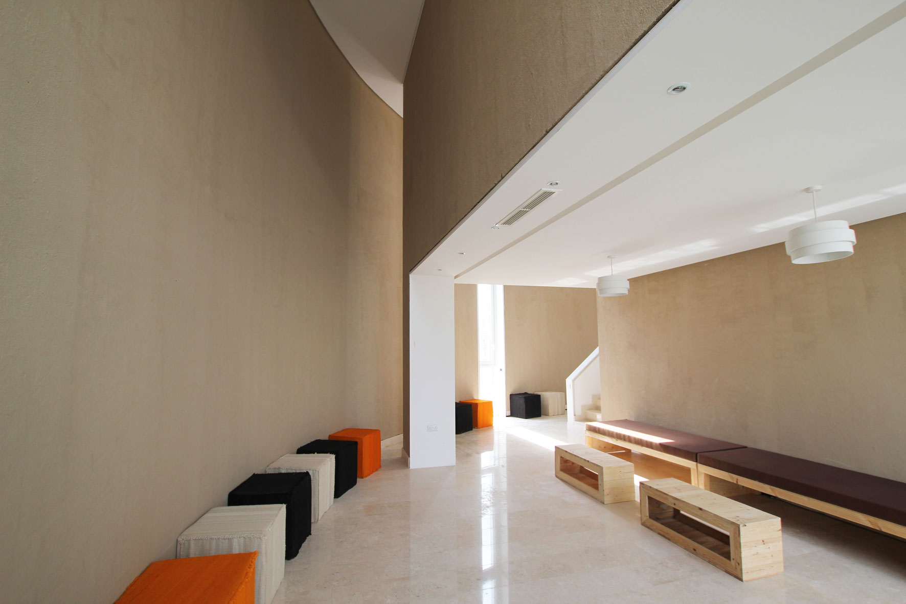 ECOHAUS est un projet de recherche en cours, issu du concours Ecohouse. Conçu, construit et suivi par l'université de technologie allemande GUtech en Oman, ce prototype d’immeuble résidentiel offre des conditions intérieures confortables dans un contexte climatique omanais chaud et humide, et atteint un bilan énergétique net zéro sur une base annuelle. Transsolar s’est fortement impliqué dans la planification et le suivi de l’ECOHAUS. Sur la base d’une réunion de lancement avec les concepteurs étudiants, les stratégies de conception actives et passives ont été évaluées et optimisées par simulation au sein d’un processus de conception intégrée. Servant de maison d’accueil, l’ECOHAUS dispose de trois chambres à coucher avec salle de bain, d’une cuisine, d’une salle à manger et d’une salle de séjour. Les stratégies passives comprennent un volume compact et cylindrique, une orientation optimale visant à minimiser les apports solaires et à maximiser la vue dégagée ainsi qu’une enveloppe étanche à l’air et hautement isolée. La masse thermique se trouve à l’extérieur et à l’intérieur. Les murs intérieurs en briques d’argile servent à atténuer le niveau d’humidité. Le bâtiment se distingue également par une ventilation naturelle traversante exploitant le vent, et comporte un zonage thermique intelligent. Des larges ouvertures au nord et des petites fenêtres ombragées au sud offrent suffisamment de lumière du jour et de ventilation naturelle en hiver. L’enveloppe hautement performante minimise les apports externes de chaleur, ce qui permet de réduire la demande en refroidissement actif. Le double vitrage à protection solaire hautement sélectif apporte la lumière du jour et minimise les apports solaires directs. Les stratégies actives visent à assurer un haut niveau de confort tout en minimisant les besoins en énergie. Un système d'air extérieur dédié, contrôlé avec roue à récupération d’énergie à partir de la température ambiante et de l’humidité, garantit des économies d’énergie et une bonne qualité de l’air. Des plafonds froids rayonnants apportent du confort sans nuisances, et permettent d’opérer le compresseur de refroidissement de façon efficace en raison des températures d’eau froide relativement élevées. Des panneaux solaires de 12,4 kWp installés sur le toit produisent 22 MWh d’électricité par an. Une installation solaire thermique couvre les besoins en eau chaude sanitaire. Le bâtiment hautement performant atteint ainsi un bilan net zéro au cours de son exploitation annuelle.