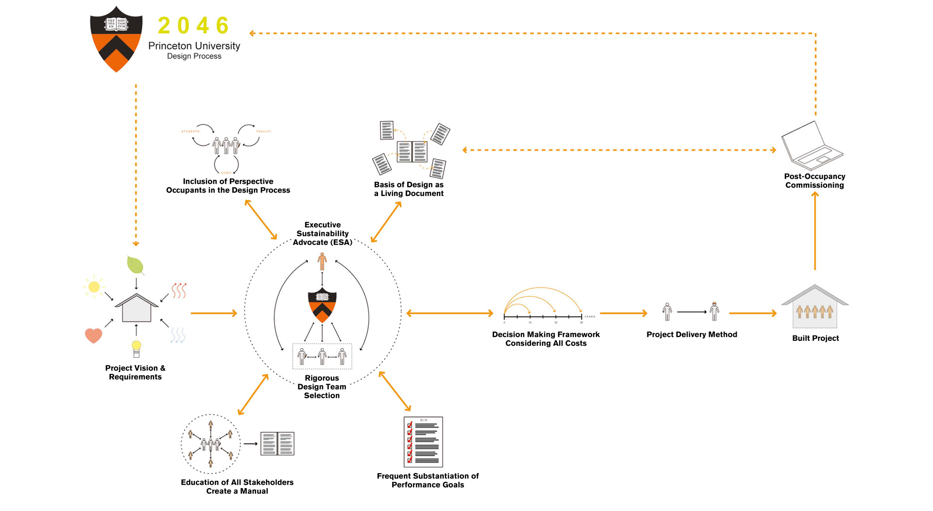 This comprehensive visioning resulted in several key deliverables: an architectural vision for future new construction and major renovations; processes and roles to introduce in Princeton’s project design and construction process for successful implementation of integrated design strategies; metrics for evaluating and visualizing performance and cost of individual projects and the campus as a whole; quantitative comparisons of the potential for energy reduction in different building types, their relative cost in dollars and in social capital, and the resulting impact on campus as a whole.