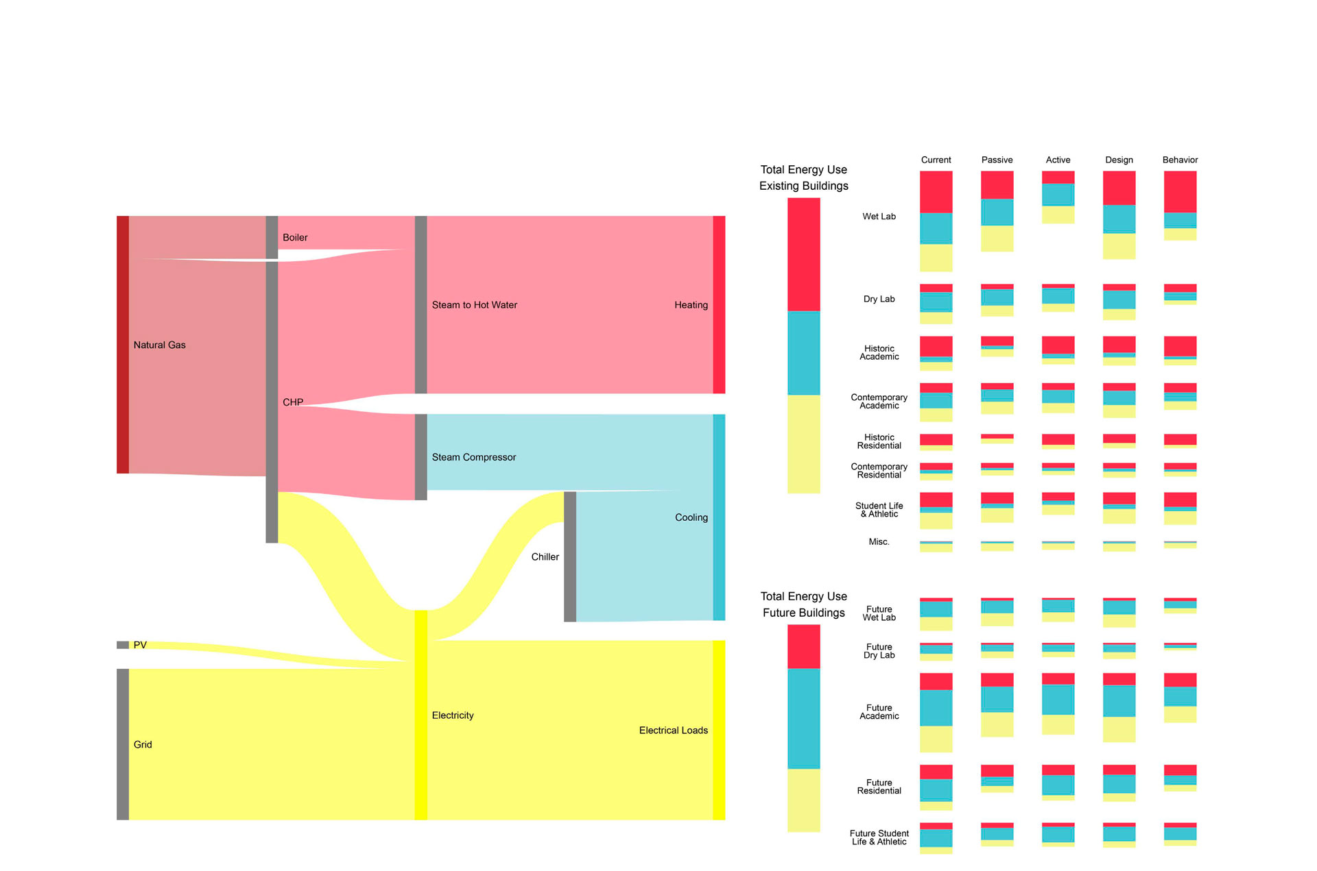 The vision and quantitative evaluations are organized around four major ‘dimensions of influence’ to reduce building energy use at Princeton: Passive design, Active systems, Design decisions (controlled by central administration), and Behavior (daily decisions and actions of individual users). A large collection of precedent projects illustrates different strategies within these four dimensions.