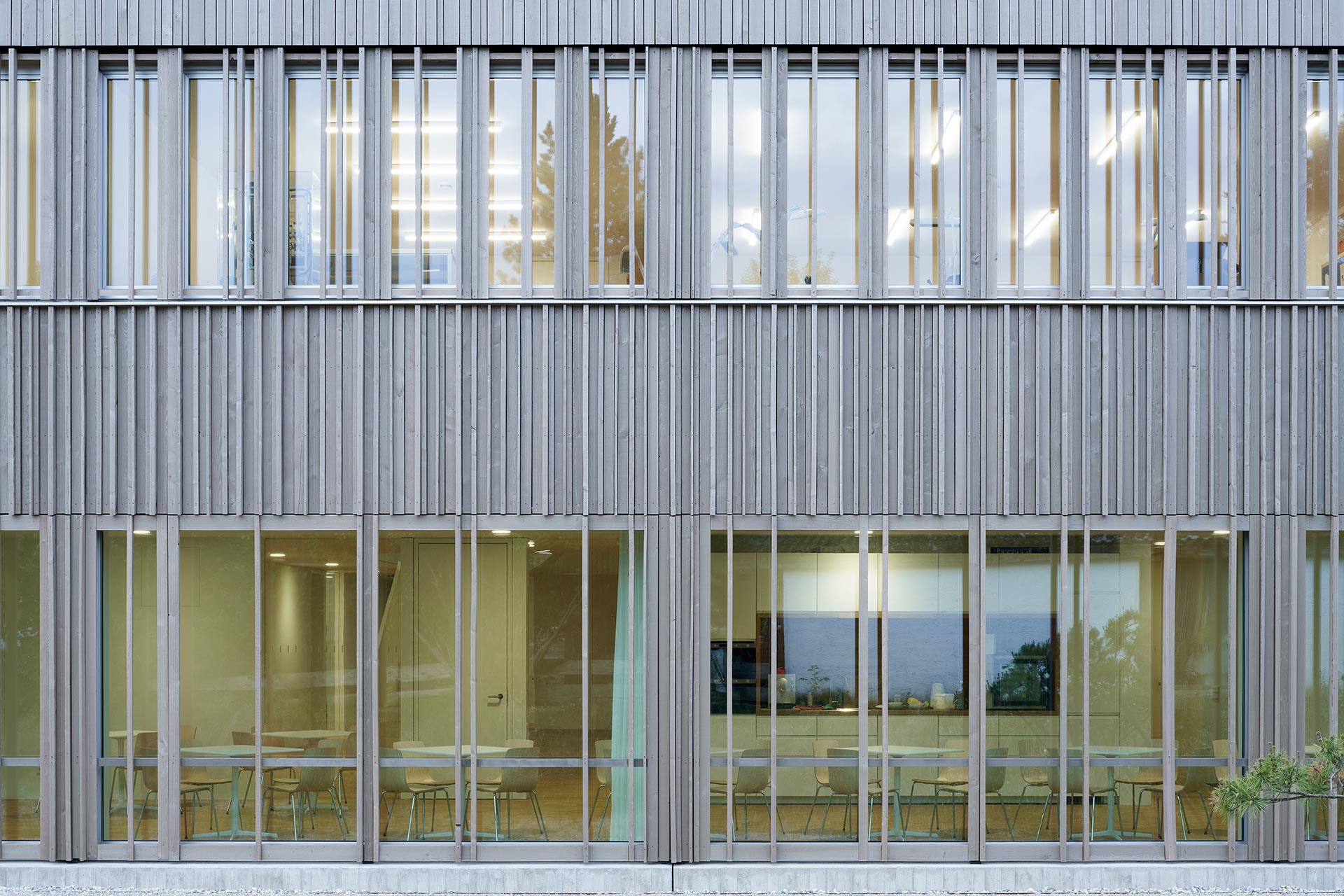 Un système de protections solaires extérieures fixes assure une protection thermique estivale basée sur le principe du "Low-Tec" : le premier et deuxième étage sont équipés de lamelles verticales en bois qui caractérisent l'aspect de la façade.