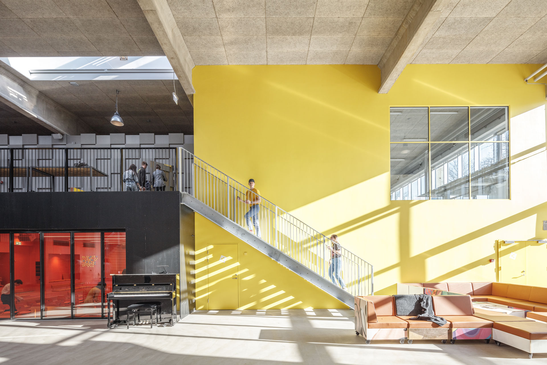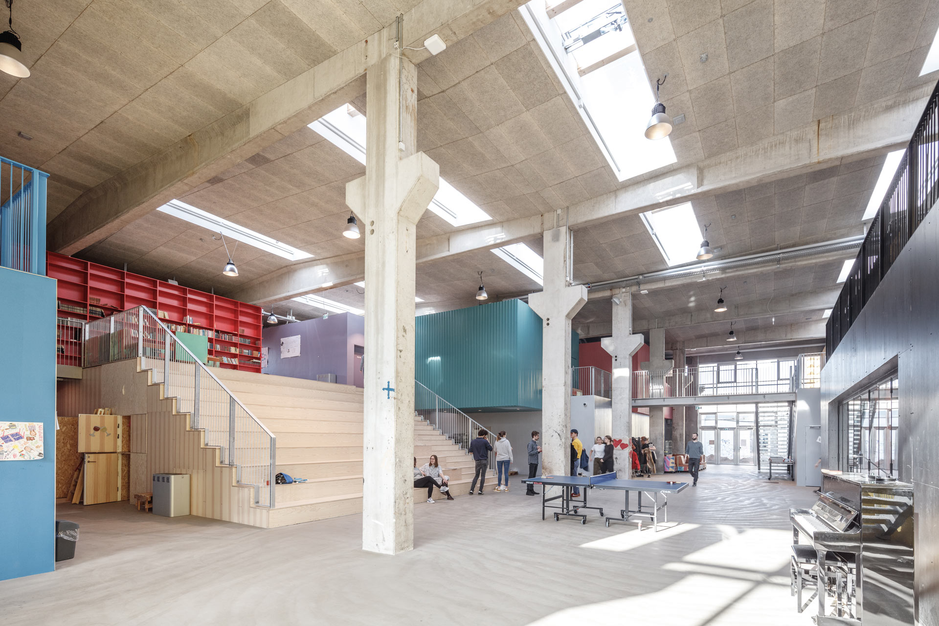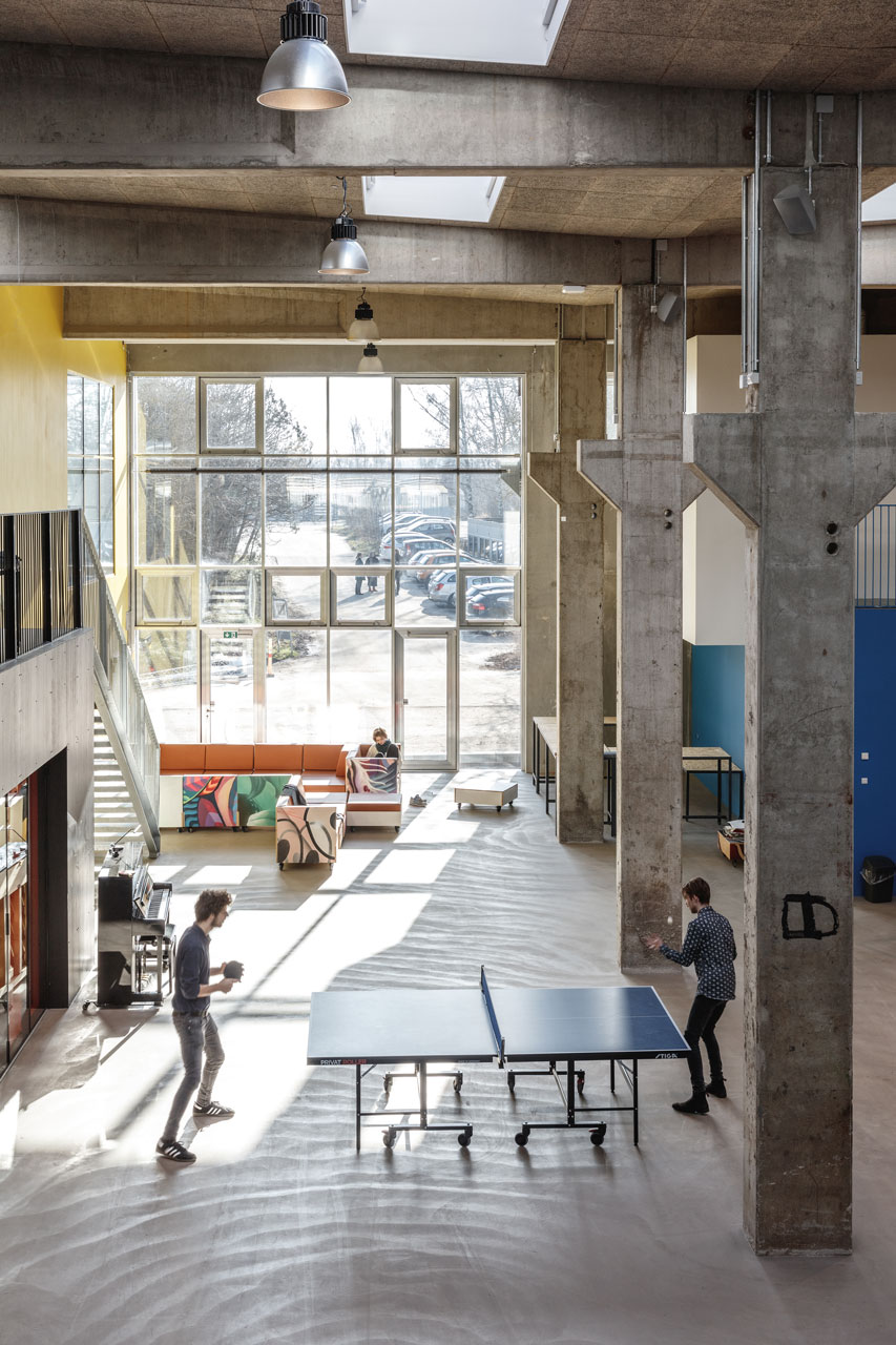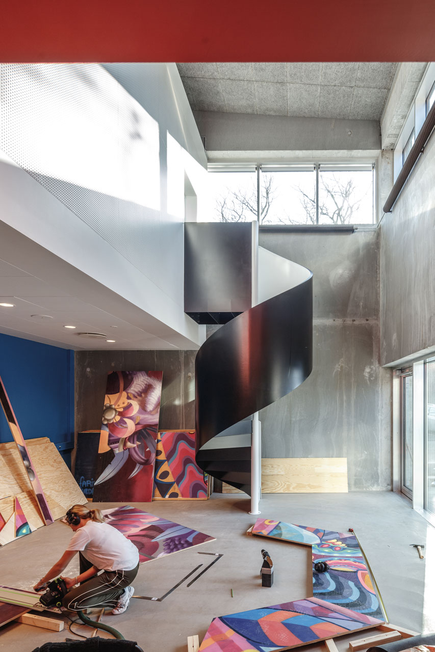 Les colonnes et le toit du bâtiment existant sont conservés, les murs et l´intérieur sont remplacés par un concept de « boîte dans une boîte »: des modules de différentes couleurs remplissent la structure du bâtiments principale, semblable à un rayonnage. L’escalier en bois est le cœur du bâtiment.